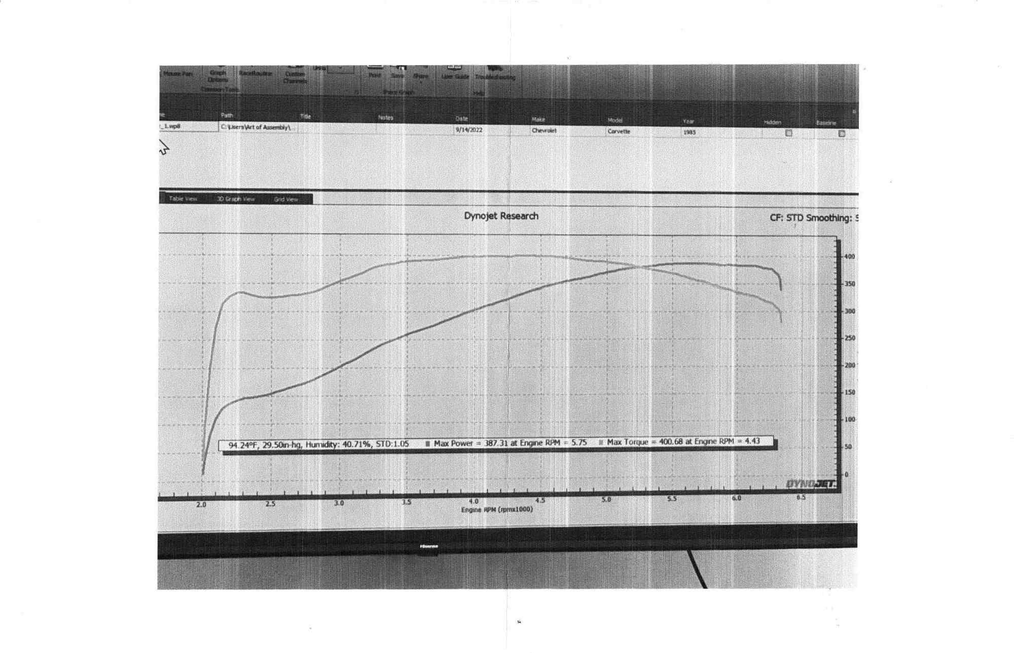 Engine: 383 stroker Gen 1 SBC (NOT just another LS swap!), 4-bolt main, 10.3:1 Wiseco forged pistons, forged SCAT rotating assembly (hand balanced), AFR 195 heads, Miniram, custom Erson cam, Holley Terminator-2 engine management, Stewart Stage 3 water pump and Ron Davis radiator; 2-qt Accusump (not installed). Dyno showed 387 rwhp before final tune.