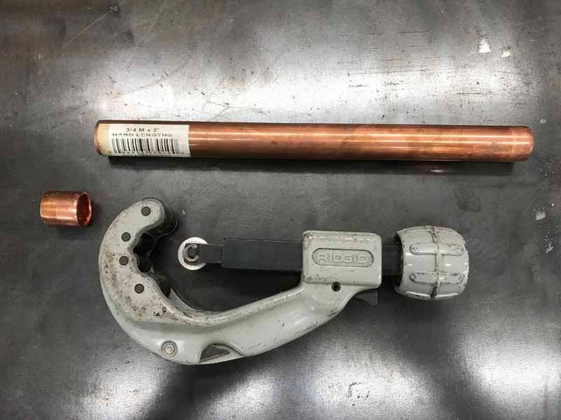 Next, with a tubing cutter, cut off a short section of 3/4" dia.copper pipe, about 7/8" long. Get a 3/8" NC bolt 1.5 " long and 2 washers.