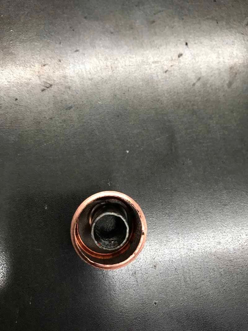 With the copper pipe removed, you can see that the 3/8" bolt threaded itself into the broken tube.