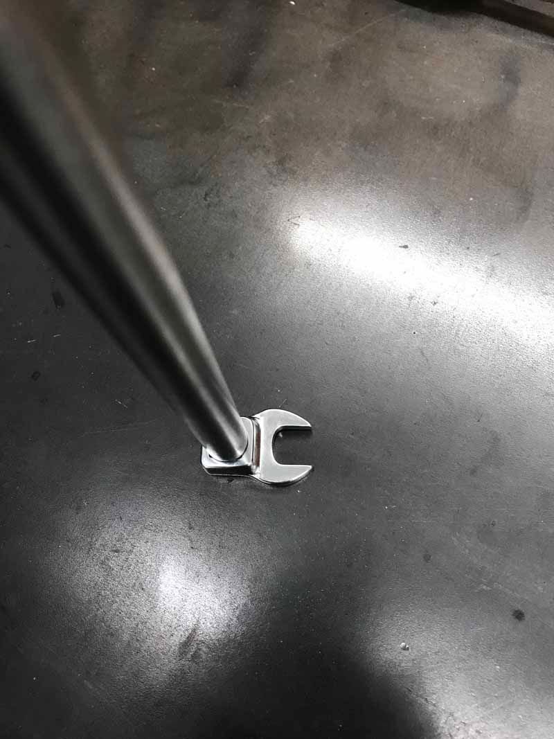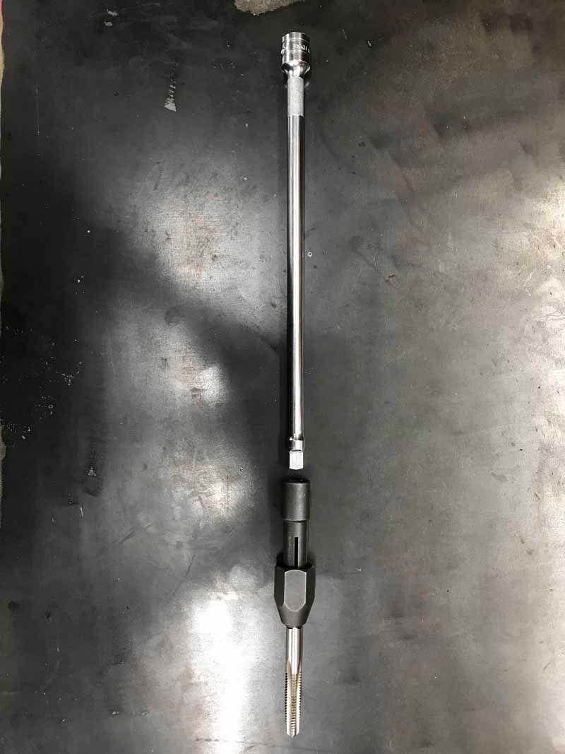Install the tap into a holder that will allow you to use a 3/8 drive extension and a short handle ratchet. Use plenty of grease on the tap to capture and hold any chips you might make. Tap threads into the broken off dipstick tube very slowly and carefully. Make sure to do this slowly and deliberately. The threads you are making in the tube will be shallow and you want any metal chips to peal off the tap slowly and get stuck to the grease on the tap. Gently run the tap into the tube until you feel the tap bottom out. Remove the tap slowly to keep metal chips stuck to the tap.