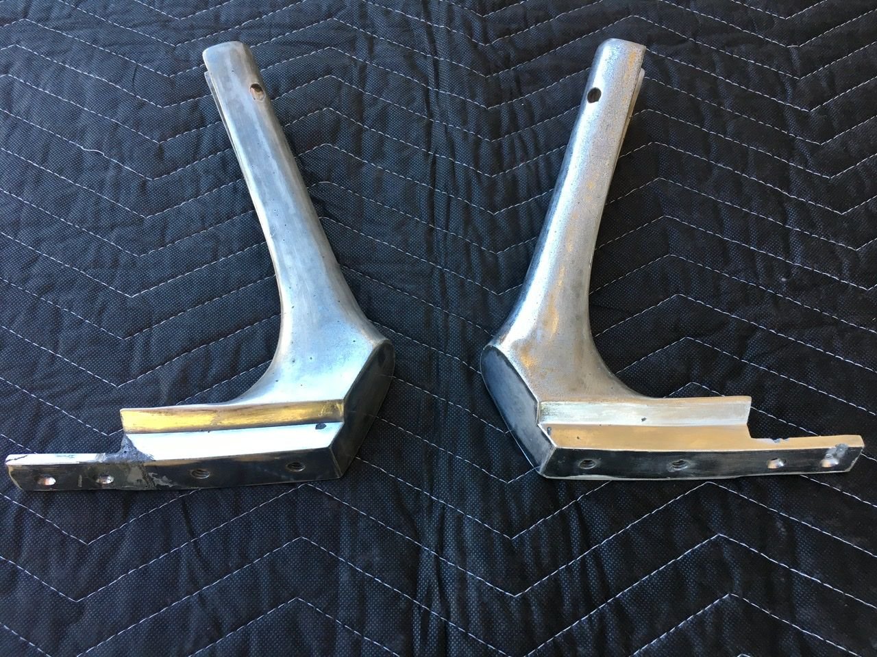 The finish is poor and these should be considered as cores to be re-chromed. The LH side has the original tab intact. The RH tab was broken and someone has re-attached the piece; I am not sure if it is an actual weld or a JB-weld/epoxy type of repair. While the repair appears solid I’m not sure if the tab would hold up well in service. Thanks.