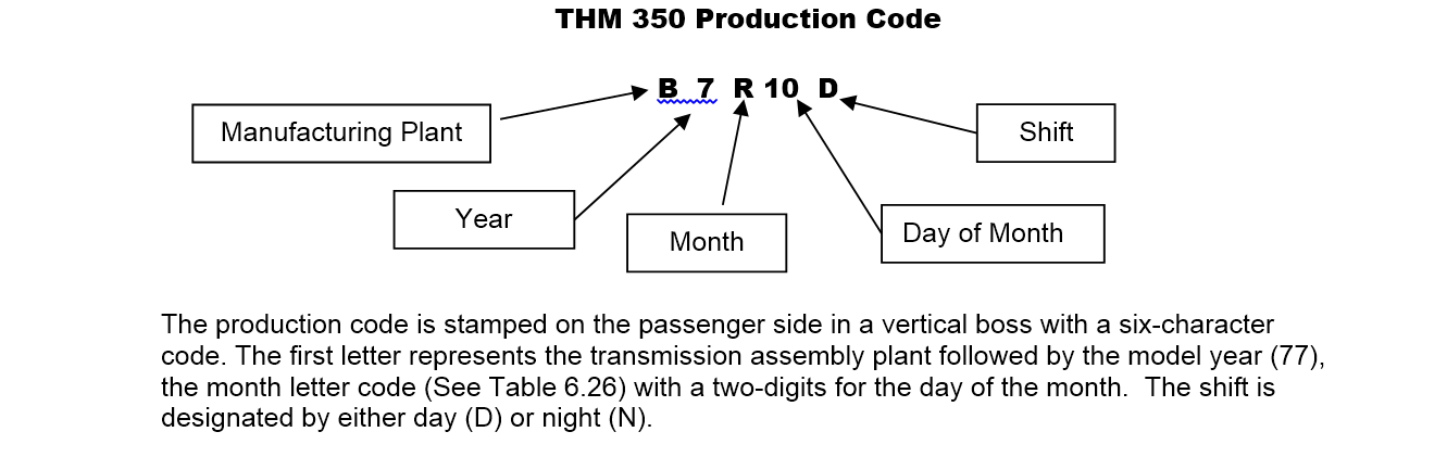 The eight-digit VIN derivative is stamped on the driver’s side, toward the front, bottom edge of the transmission just behind the rubber boot that protects the shift linkage. Often, the broadcast code 5TL, stamped in black ink can be seen on the passenger side. The last five digits of the VIN derivative will match the VIN on the driver's side windshield post.