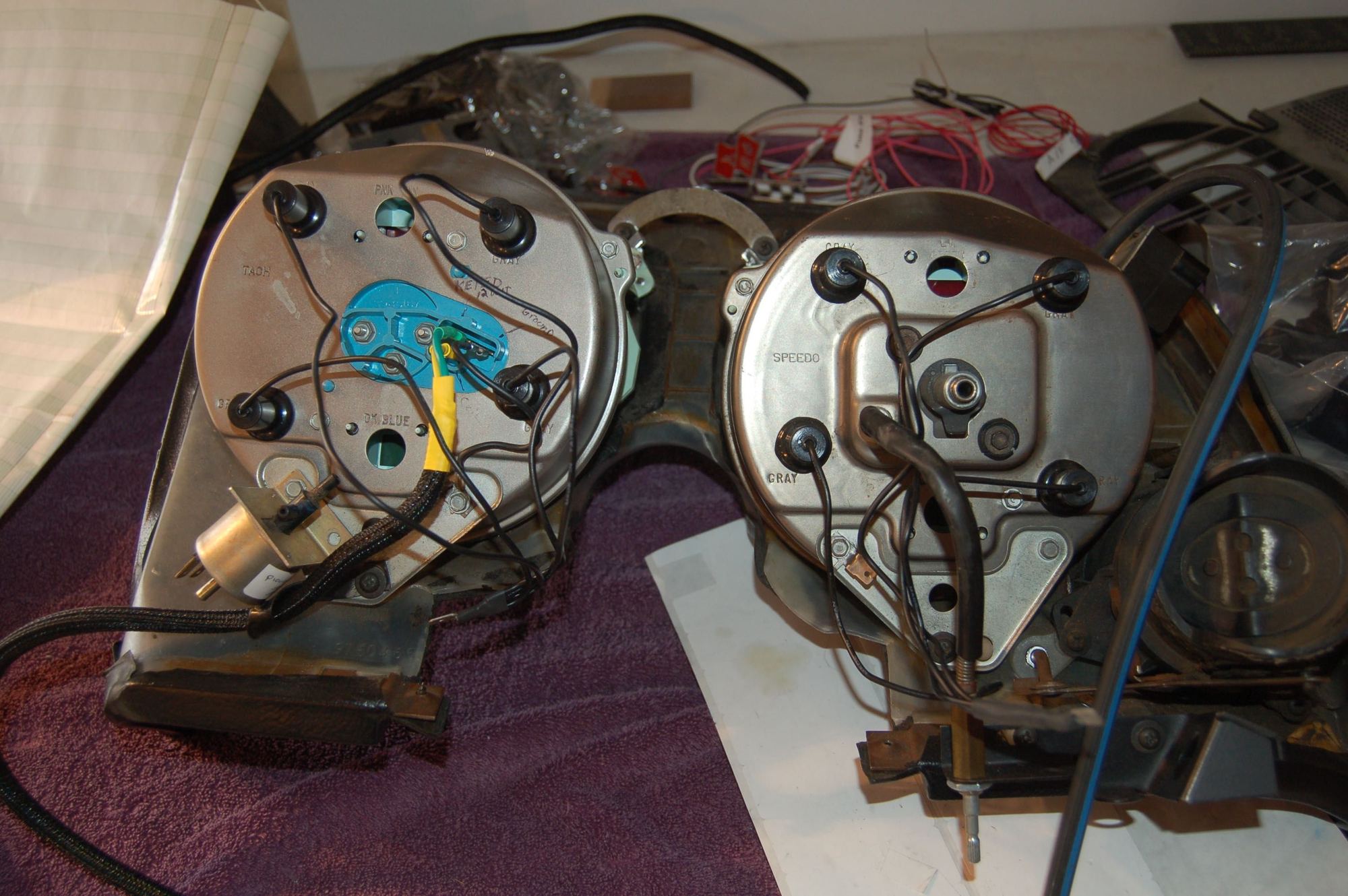 I also replaced all the incandescents with LED's and tied the source wires all together . Lower current draw. Finally I put a connector on them so I could hook them together with a source in the harness after installing the instruments. Any source would do. That way I could have all the bulbs in place when reinstalling the cluster.