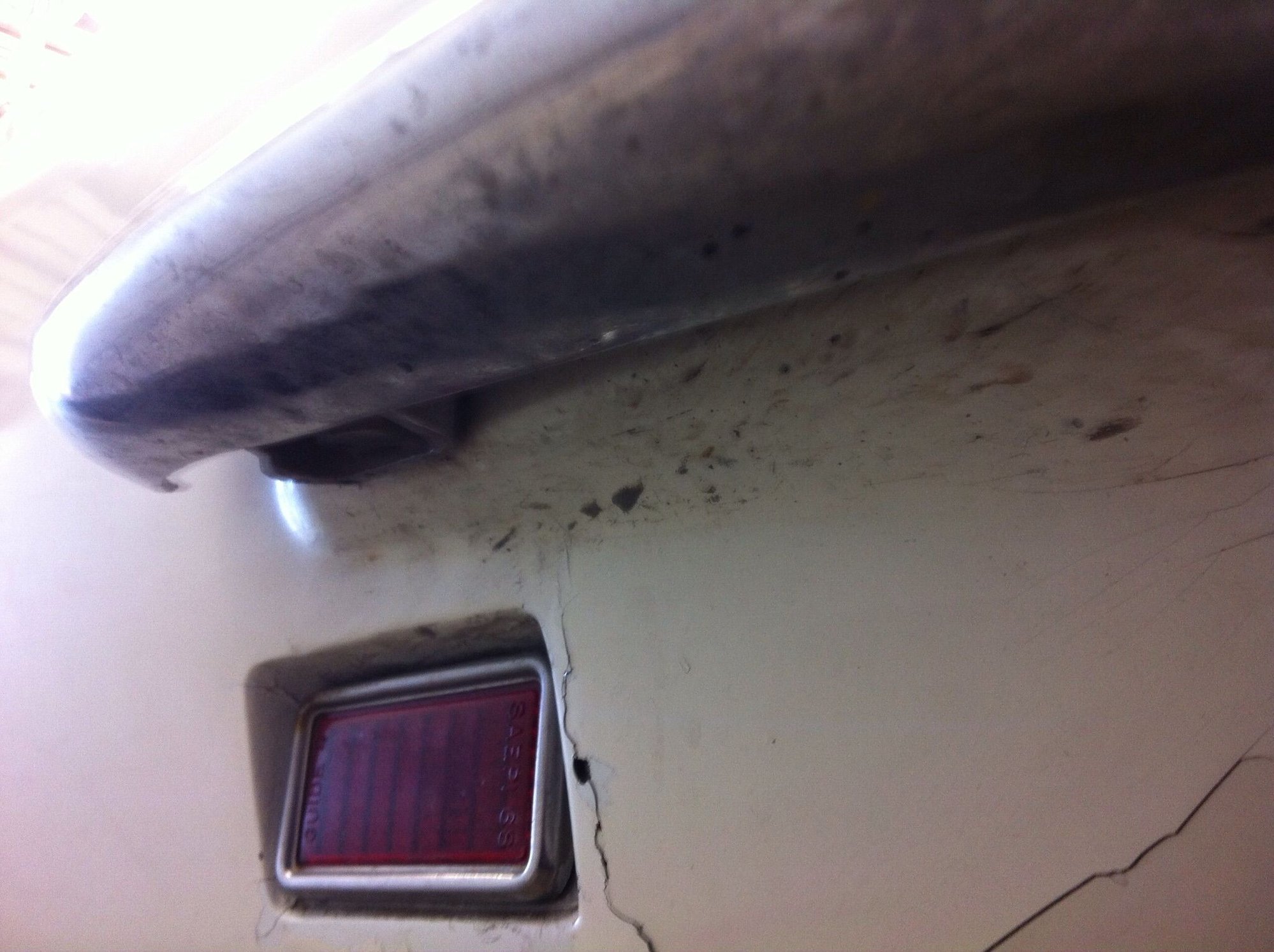 While unloading our girl from the trailer at the shop, that will be doing the suspension and brake work, one of the employees dropped a wheel chock and it lodged up under the drivers side rear end. I heard a loud crunch and went (fearfully) to see what it was. The entire under/rear drivers side is crushed in TNTC pieces. The glass is shattered and crushed in from the drivers side rectangle turn signal, all around the chrome bumper mount and around the muffler!