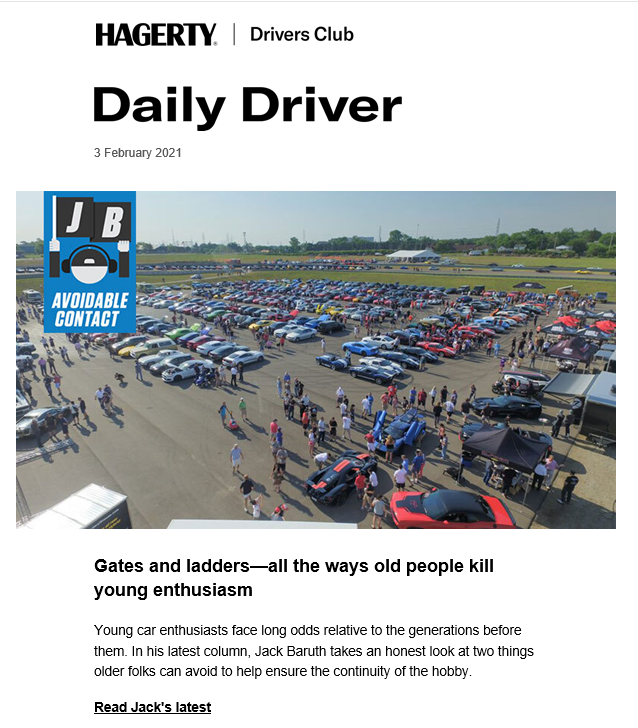 He's right on some of the counts. There's an entirely different entry level dynamic than when many of us were in our formative ages. I've seen some of his examples, even here in the Motor City. Never really pondered the sobering, urgent challenges, scarcities and looming legislative realities for entry level enthusiasts -and, us - as he lays them out. We (all) have to adapt and be inclusive of the current, up & coming generations or plan to write off our legacys.