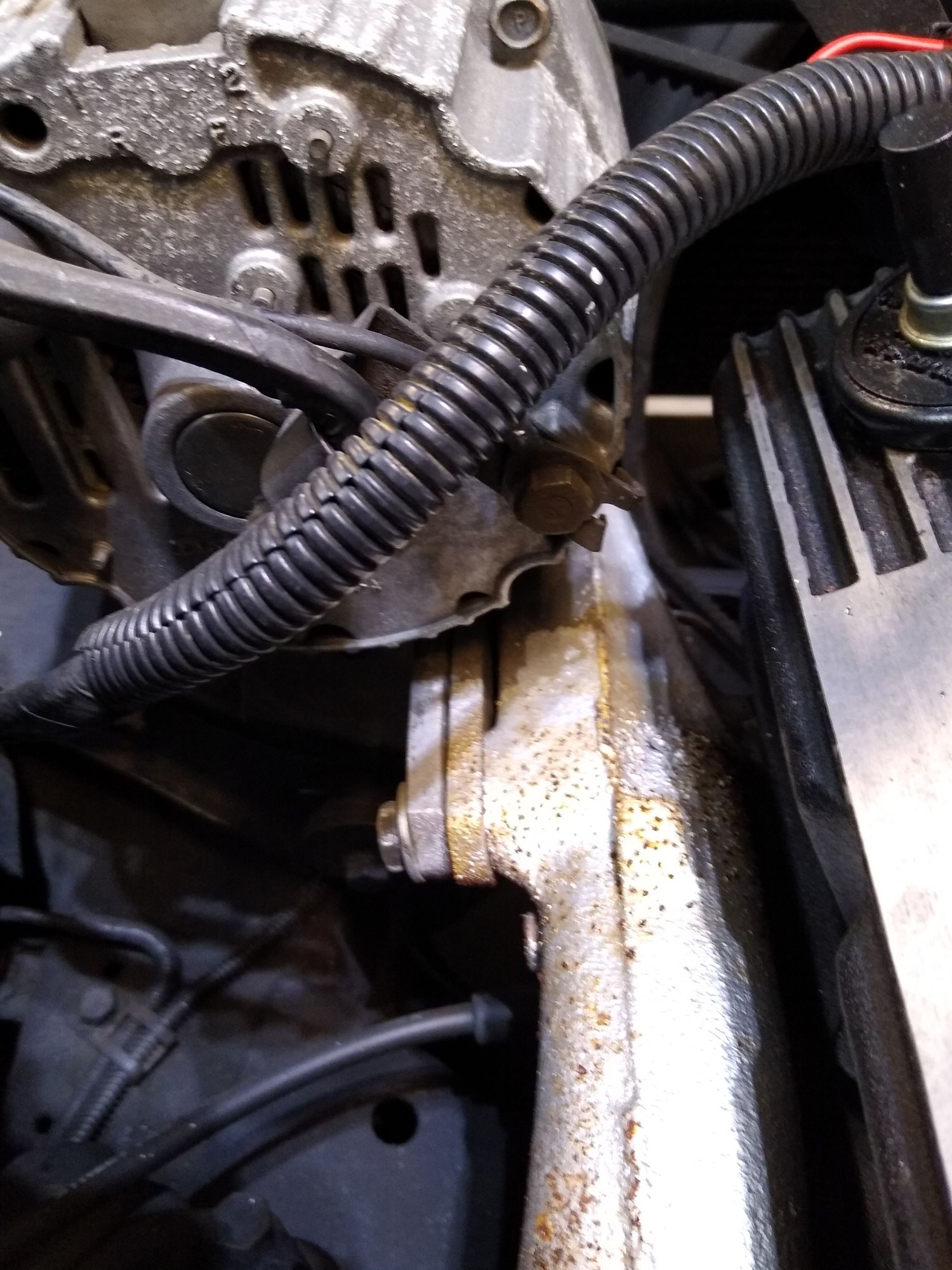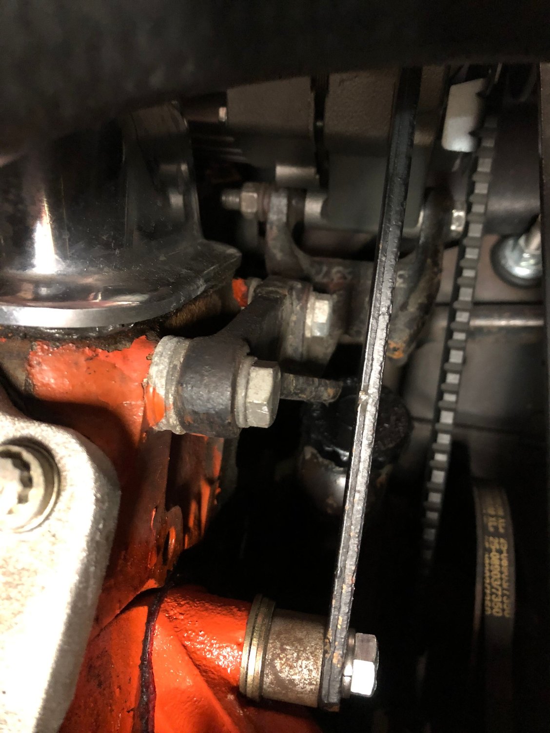Here are a couple pics from the other side. The bracket is surely stock/original. There seems to be plenty of room for a longer belt but the pic isn't the greatest.
