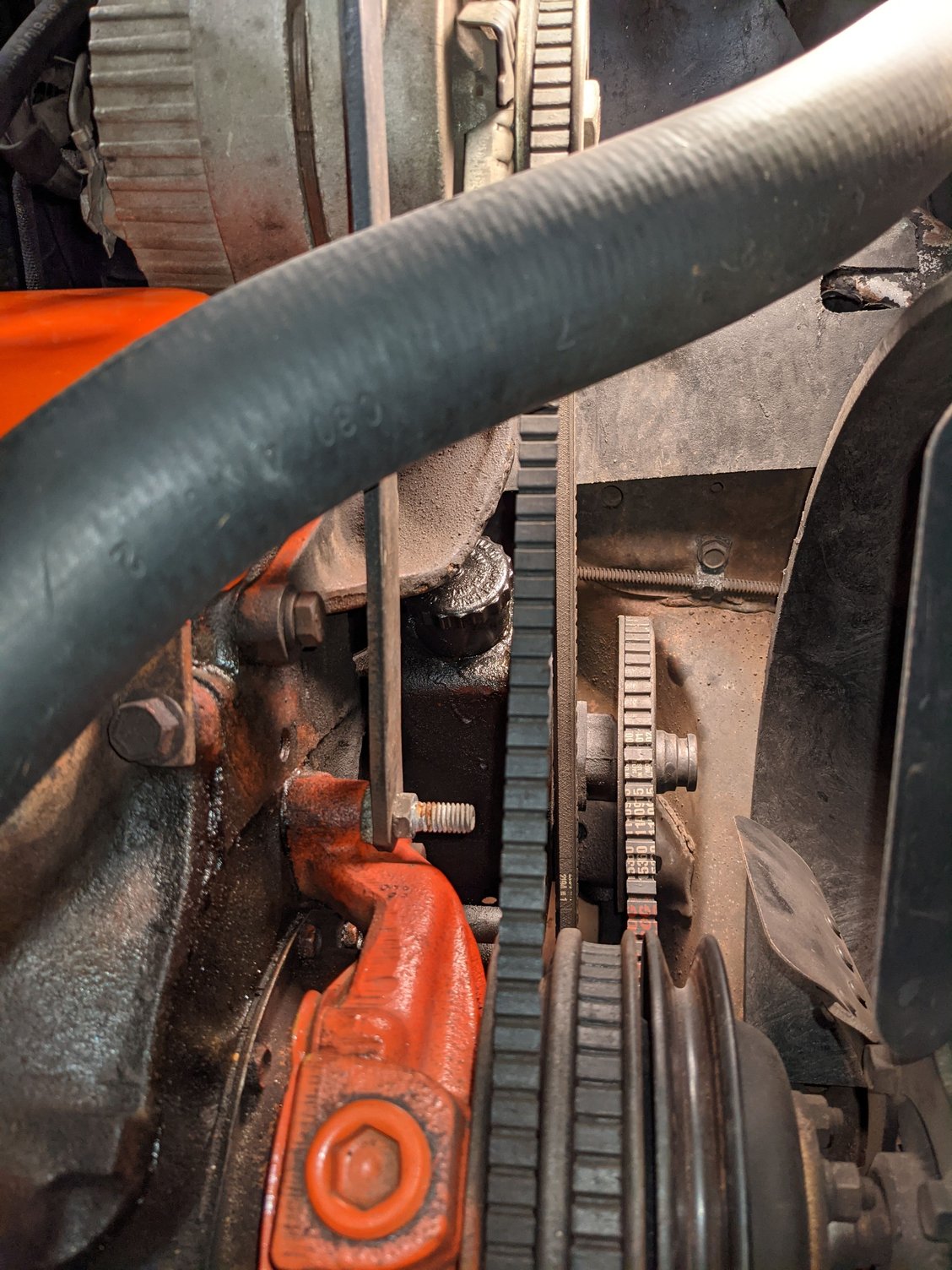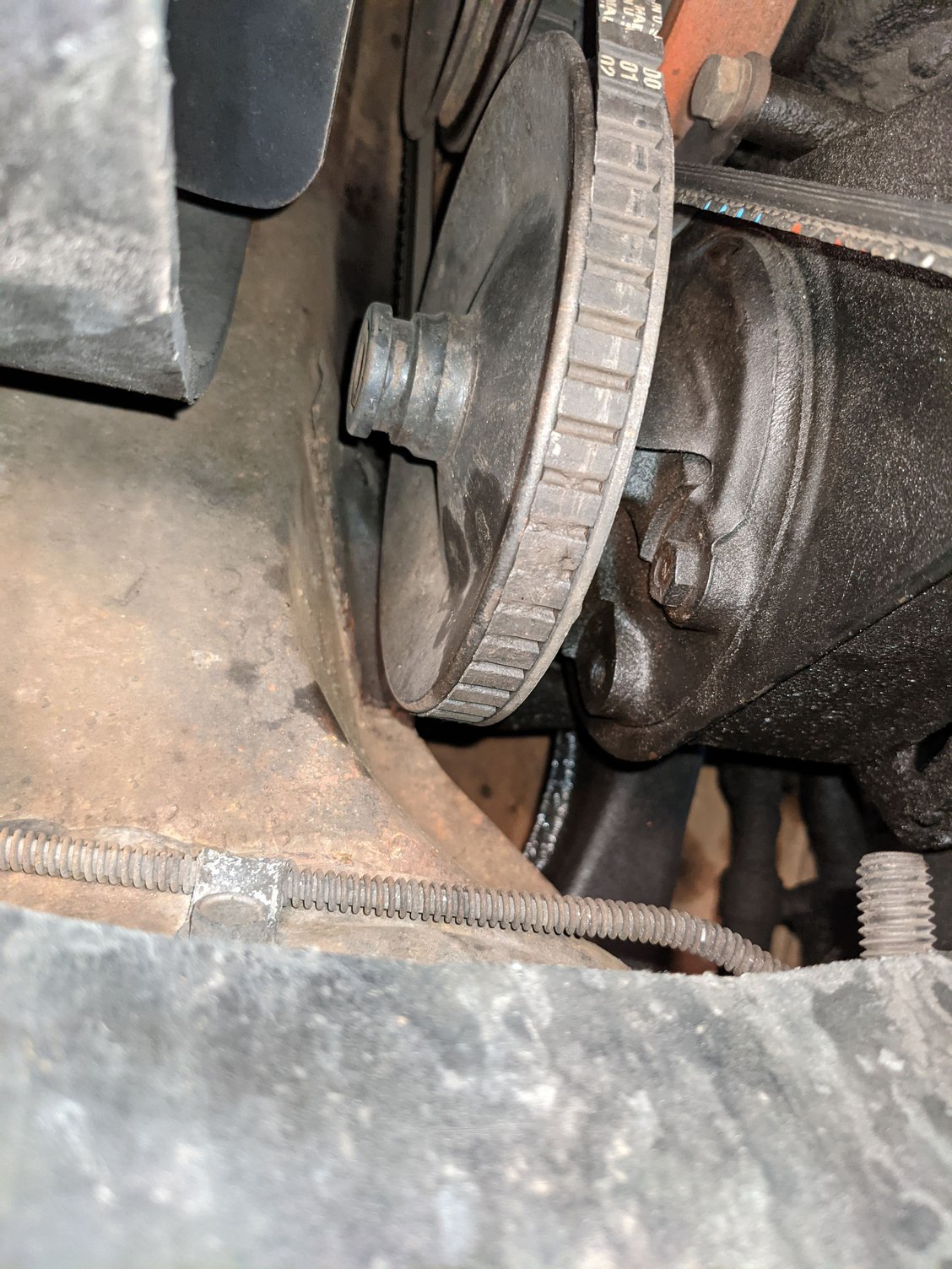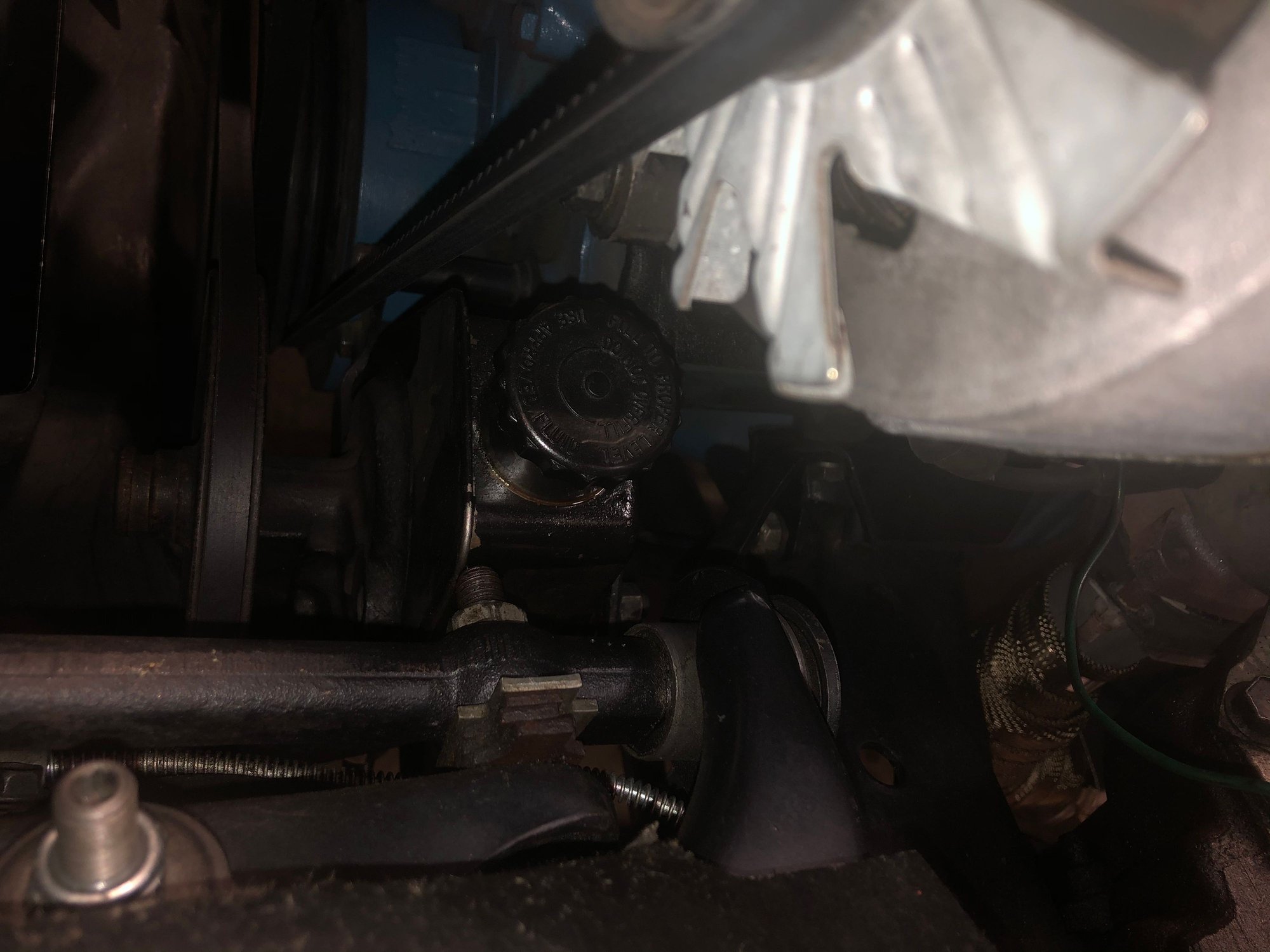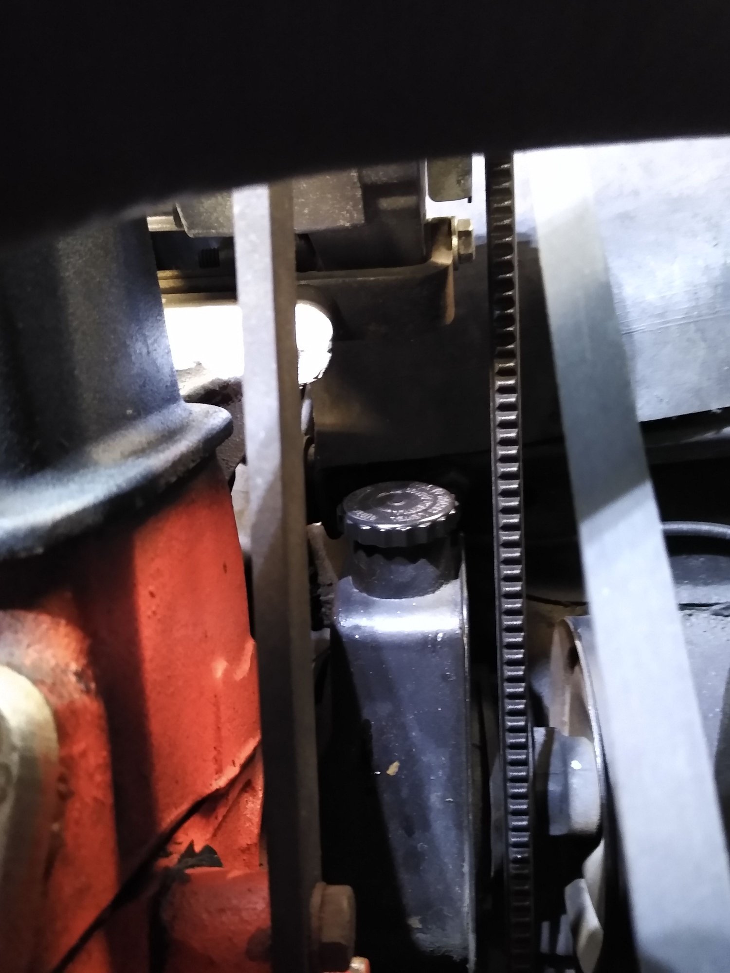 When you can, properly secure pump with a correct bolt that allows you to move pump through it's adjustment range and see if you can then remove the cap. On my '77 it is tight clearance also. If belt is too long the PS pump pulley will get really close to the frame rail. mike...