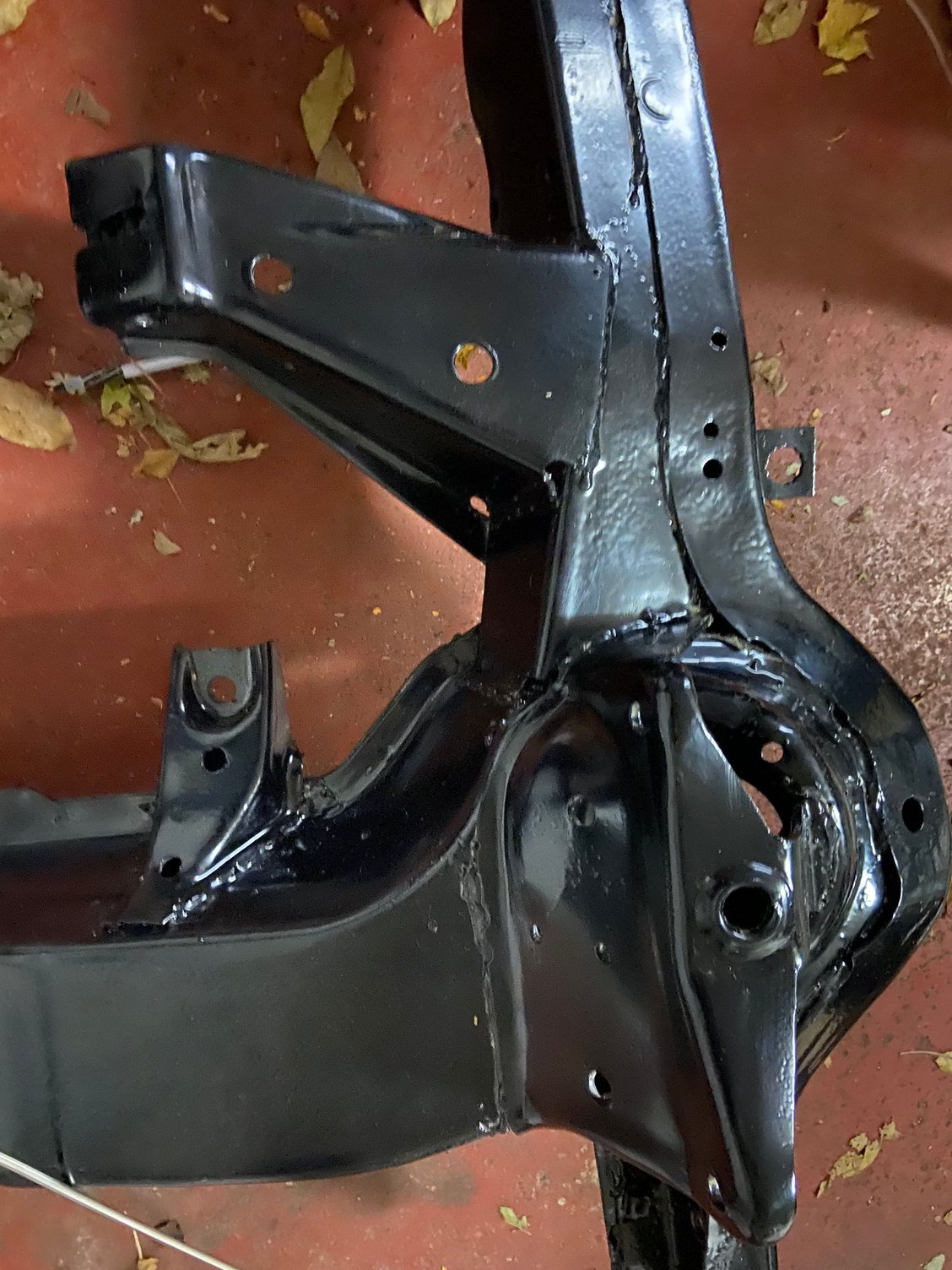 Powdercoating is the best option, in my opinion. I paid $600 to have the frame sandblasted and powdercoated. That is a deal. Epoxy paints and primers are not cheap, and the blasting is a must. My process....I used dye grinders and sanding discs on an air driven tool, and remove ALL the weld spatter, small beads of molten metal, poor welds, rough edges, etc. I also round all sharp edges, because powder will stick better to round than sharp edges. THEN I take the frame to the blaster, and have the entire frame blasted. Bring it back home, and do all weld repairs, etc. The frames are stagger welded,.....I fill in between the staggers, and grind out any poor welds and weld as it should be. Some people put bracing in strategic positions, I haven't. Once this is all done, it goes to powdercoating, with a very nice semi gloss powder.....and it comes home BETTER than GM ever dreamed. I then used Eastwood internal frame coating,....now made in black, through all the many holes in the frame to coat and protect the inside.