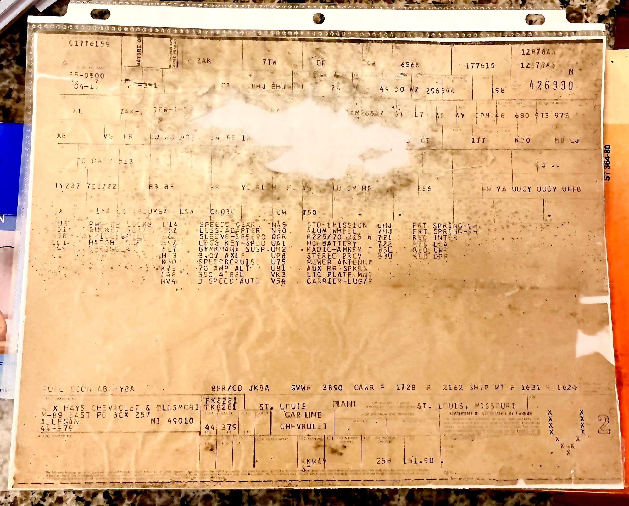 You’ll notice from the window sticker that I have the V54 Roof Panel Carrier. I haven’t even taken the brackets out of the bag yet, nor have I removed the roof panels yet. You can see the bracket attach points here. Of the 40,614 vettes built in 1980, 3,755 had this option.