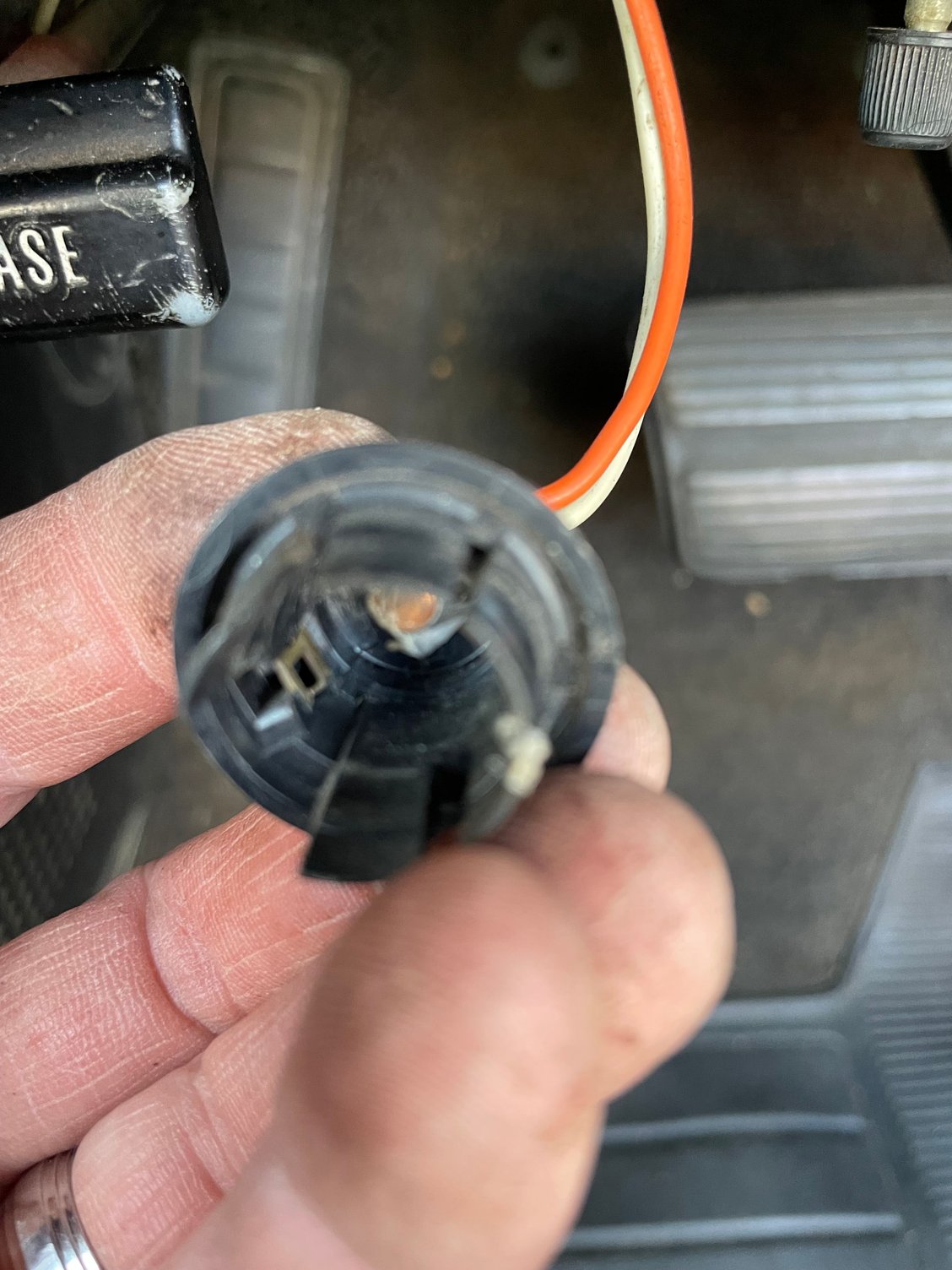Didn't find immediately on my wiring diagrams and wanted to save some contortionist moves so thought i would just ask. Is it a bulb socket and goes somewhere in the dash? Maybe someone will recognize it. Found it as I was removing the kick panel to check out my #2 body mount/birdcage location.