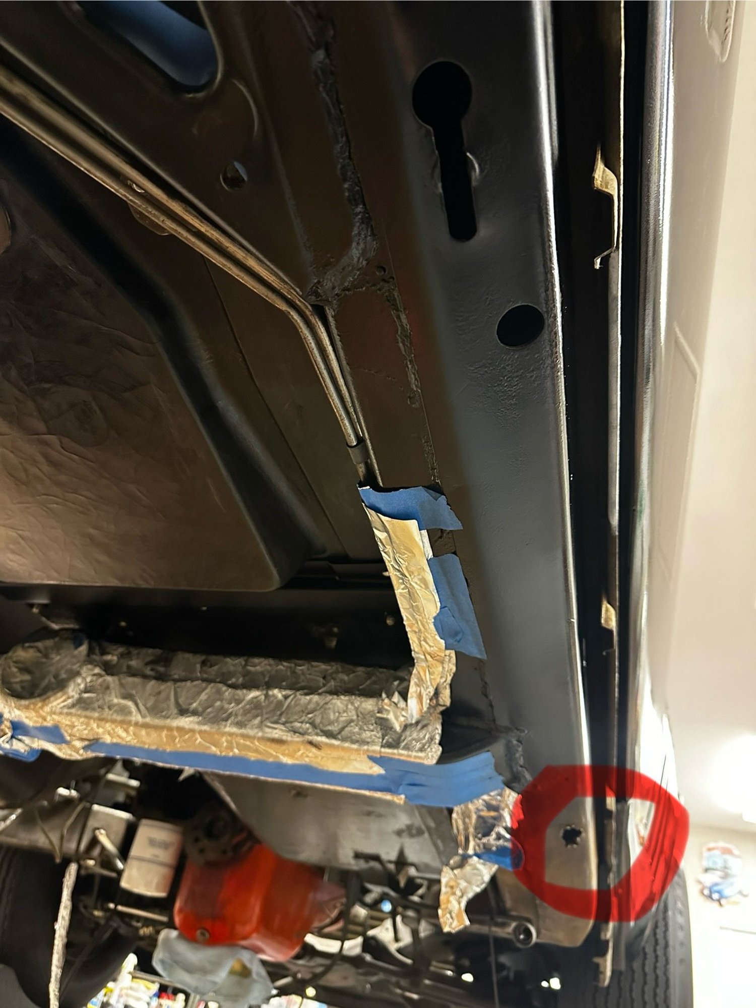 A little bit less of a bubba hack job on the LH side but in the same location about 6 inches back from the bottom front edge of the door. It looks like a factory hole is there and they just cut it bigger