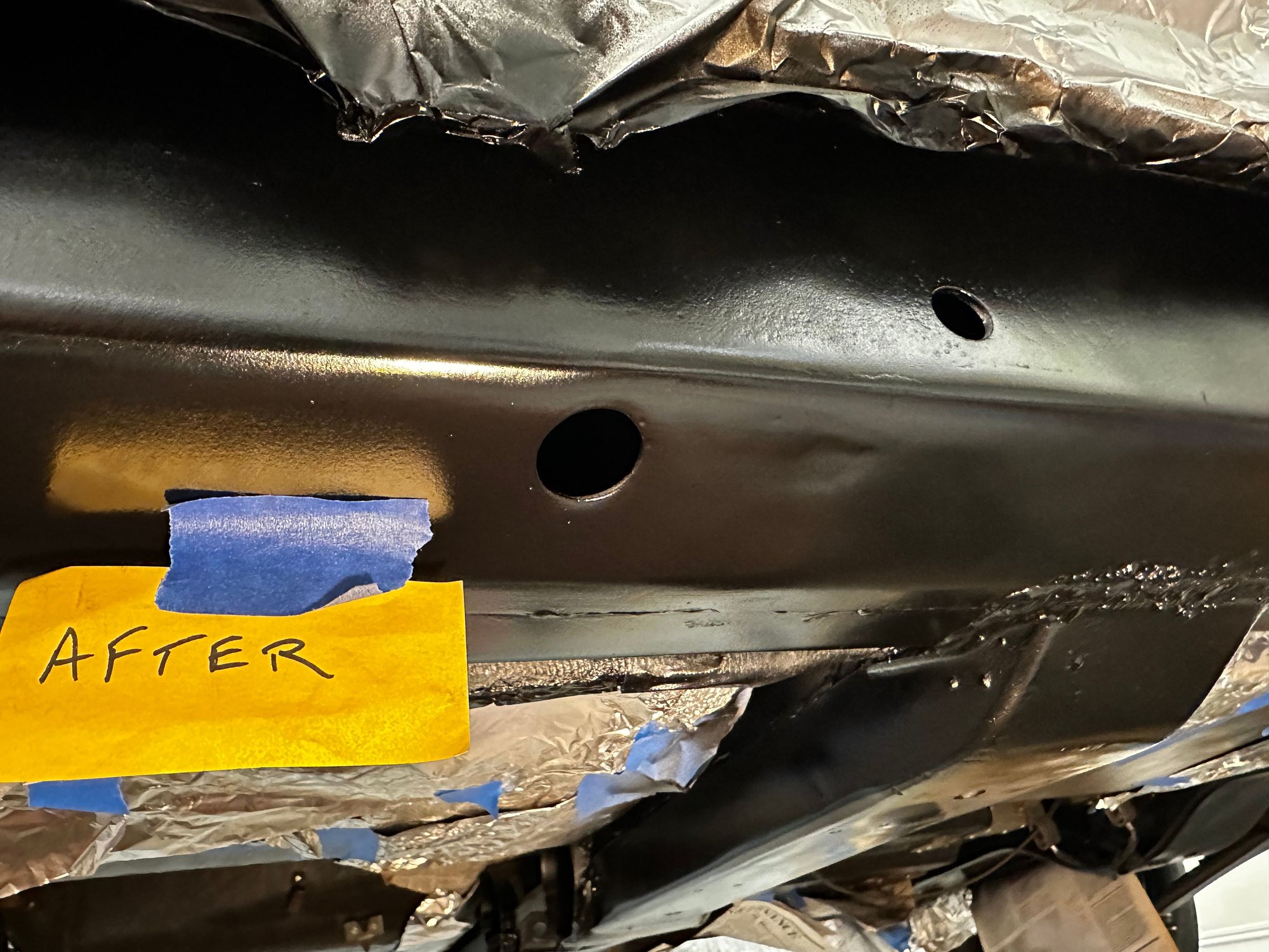 RH frame repair completed. Thank you Grant for the template to locate the hole openings. Will now sand the welded areas with 80 grit and then 180 grit. There are very slight depressions in the frame, may have to use a little body filler to level those out. Self etching primer and then 2 coats of semi-gloss black. Will try to post a final pick once all the holes are painted and done.