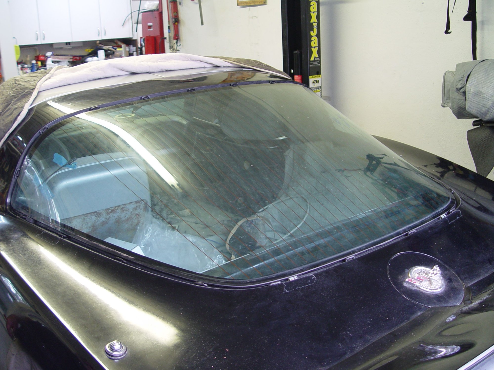 Dry-fit #1: With the rear window valley cleaned, the window was dry-fitted with the blocks to get a feel for the gap, top, bottom and sides. The blue blocks are the originals used by the factory; the glass butts up against these rear blocks. Blocks on the side are from Zip; the glass edge rests on top of the block on each side.