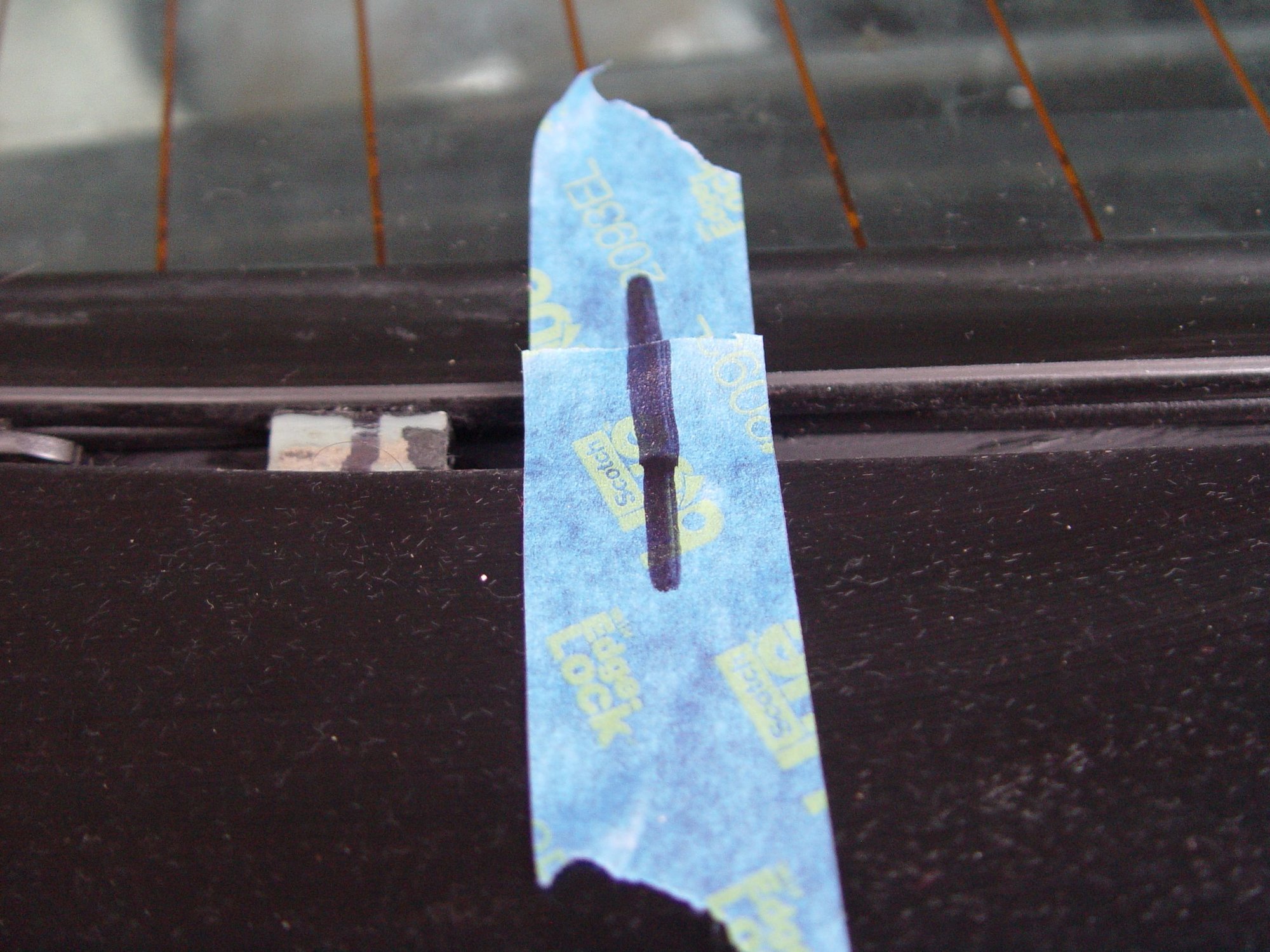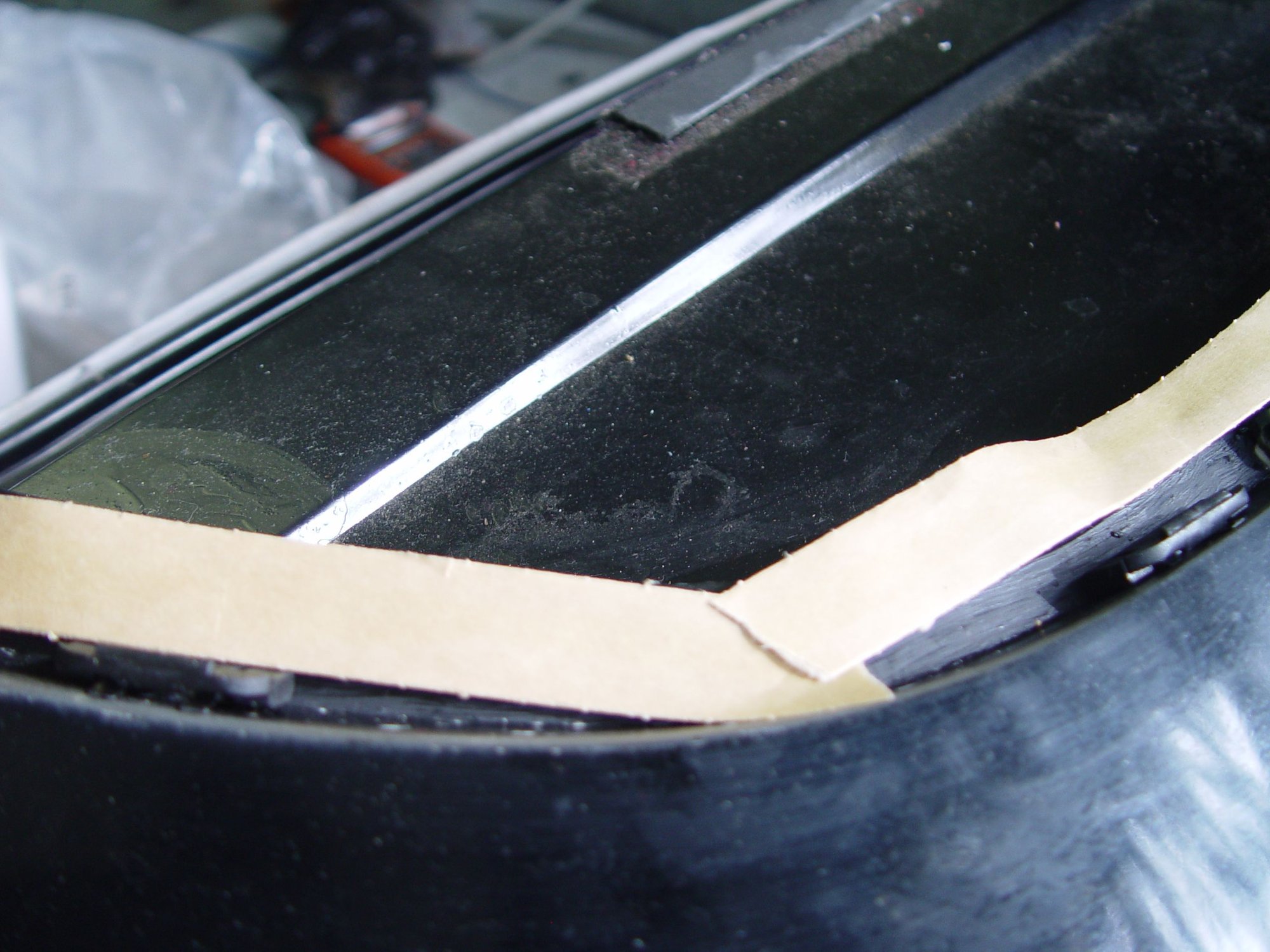 Primer & blocks: The inside of the glass was prepped with tape to avoid butyl primer dribbling onto the visible surface of the glass. Afterward, the primer was applied to the edge of the glass and to the body surface where the glass will eventually rest. An attempt was made to glue the rear blocks in place...as noted with the masking tape. The body valley has slight indentations to position and mount the blocks. Time was allowed for the primer to dry.