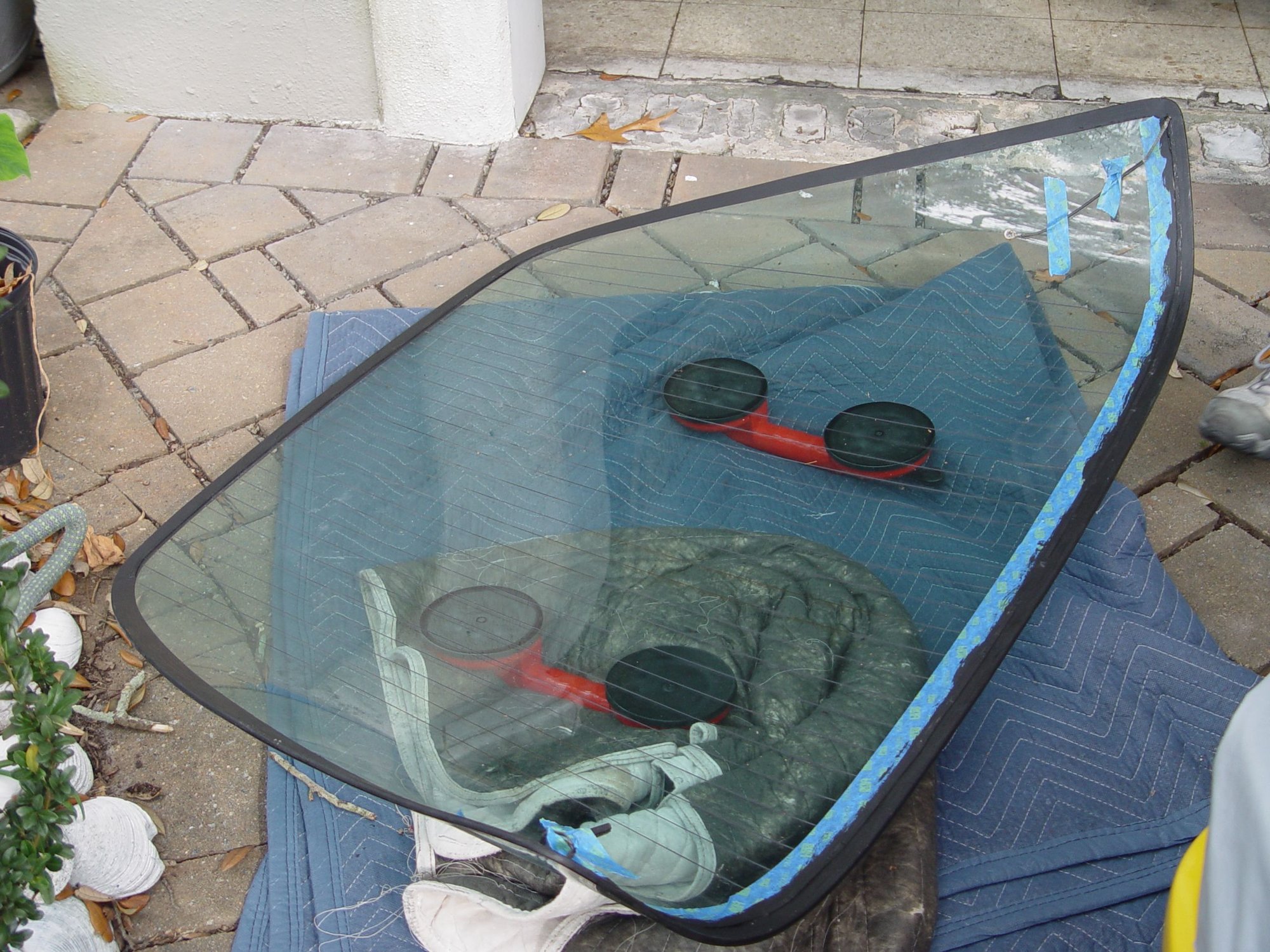 Window Prep: Kanvasman had previously replaced a window and offered to assist. I took him up on his offer...to avoid his lessons learned. That's what we worked out and share here. The glass and body rear window valley had been cleaned thoroughly with 3M Adhesive Citrus remover. The Zip glass replacement kit was used and included primer, butyl tape and two placement blocks. See previous discussion thread; link above.