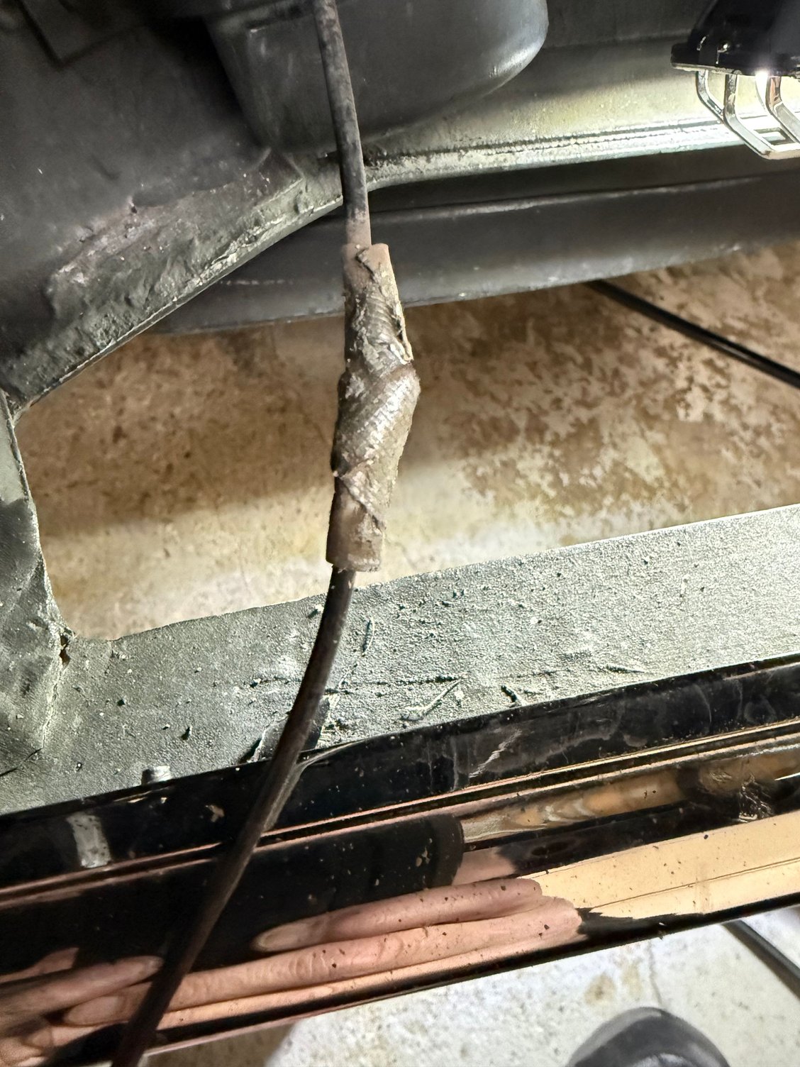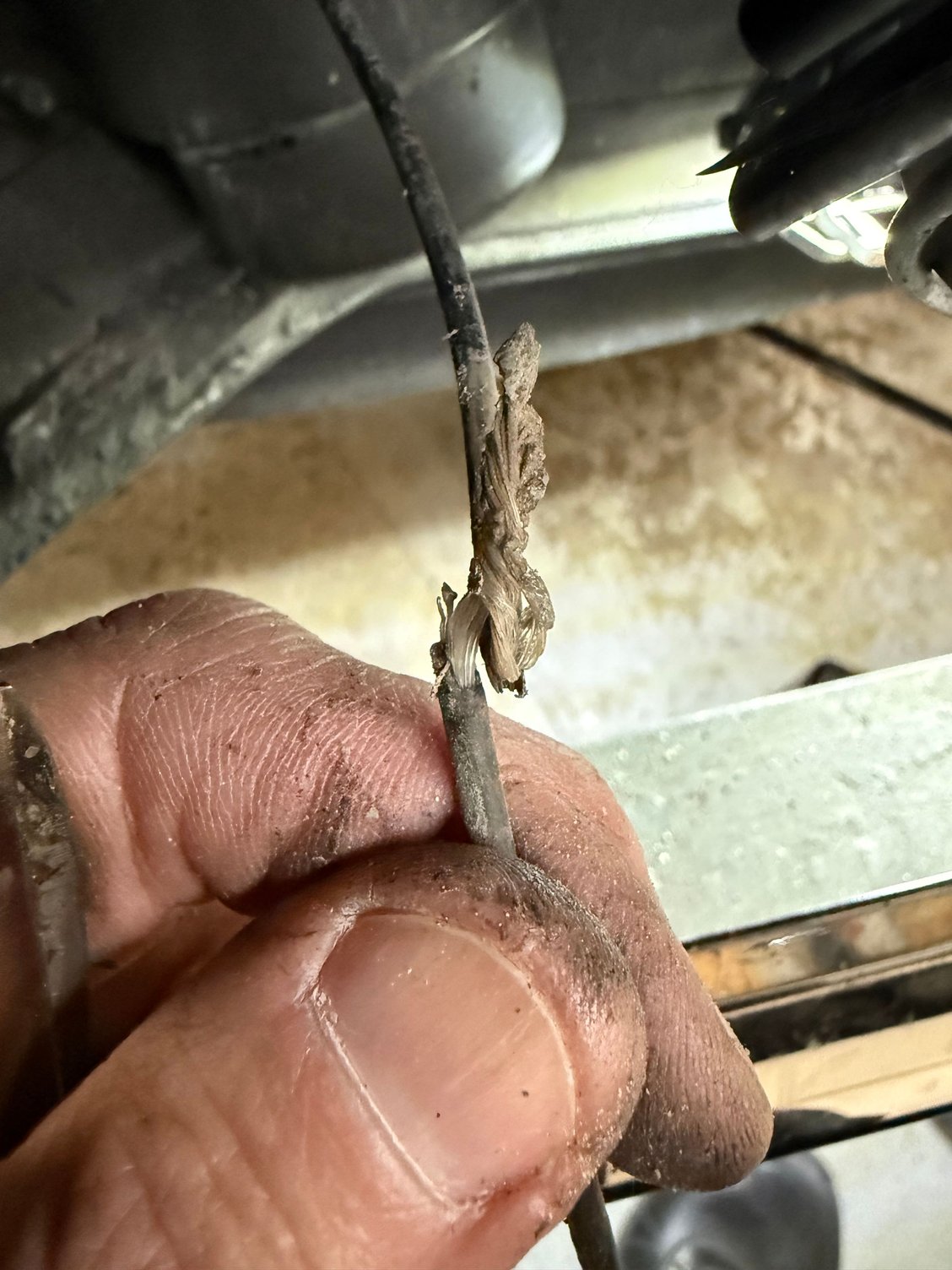 Fortunately, they cut through the entire wire bundle above the LH muffler, I'm guessing while replacing the stock mufflers with Flow Master mufflers, so they got lots of practice splicing that day. It's hard to fake stupid.