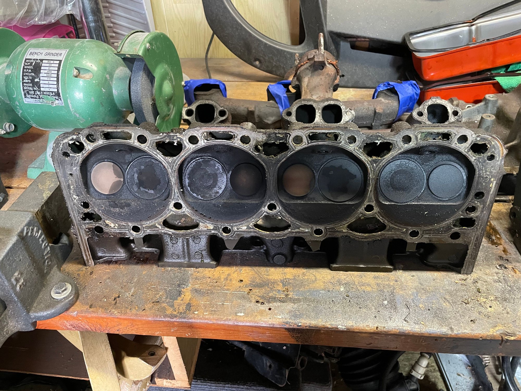 Somebody has been in there, chisel marks on freeze plugs to hold them in place. Double timing chain. Maybe a shim under the valve-spring?