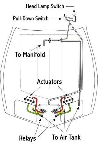 as my name states my first vette 1975 bought in april 37th bday present!! head lights are up all the time. have vacuum at relay tee, holds vacuum in tank if i remove yellow hose from left relay and plug off relay and hose to tank... light works, same thing on right side... just dont work together. i have read todays forum on light problems! checked the links! thanks for the help so far. i'm stumped any ideas