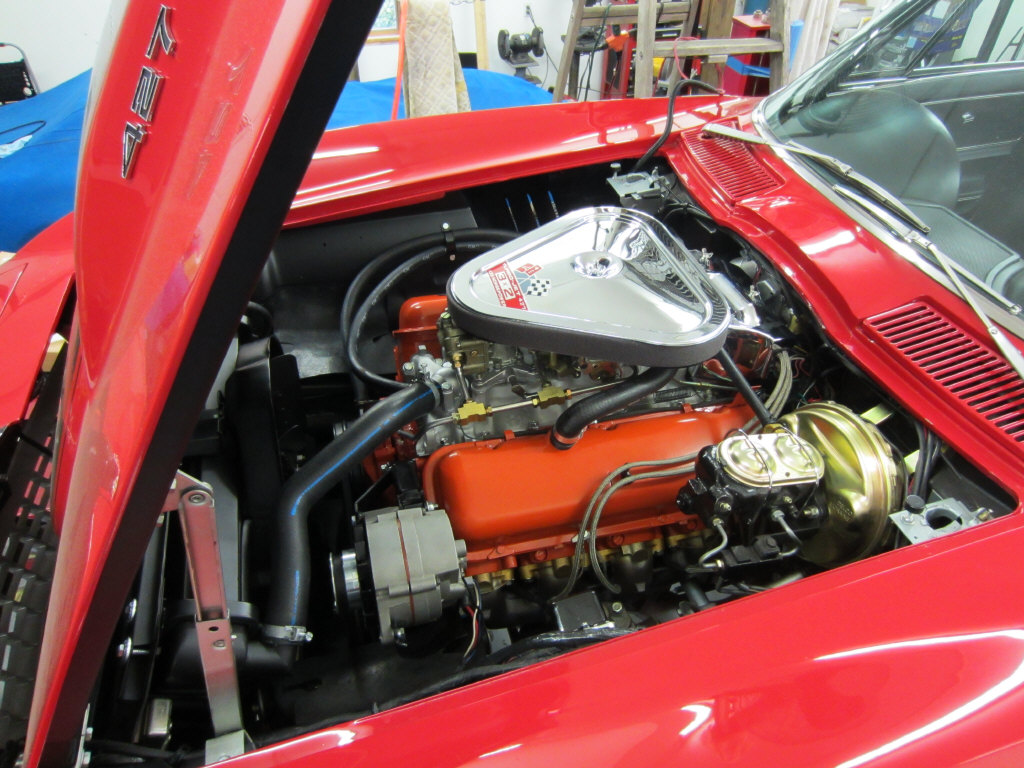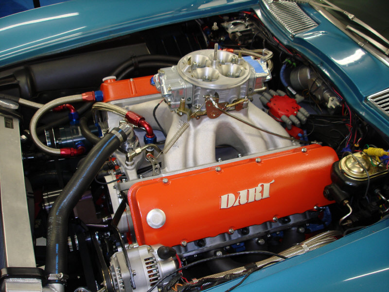 10 to 1 comp, custom Ross pistons, 4.25” Eagle steel crank, Eagle H-beam rods, Holley Strip Dominator intake, Internally balanced, 4 bolt Chevy block, Hooker Side-pipes, highly tuned Holley 1000 HP carb.