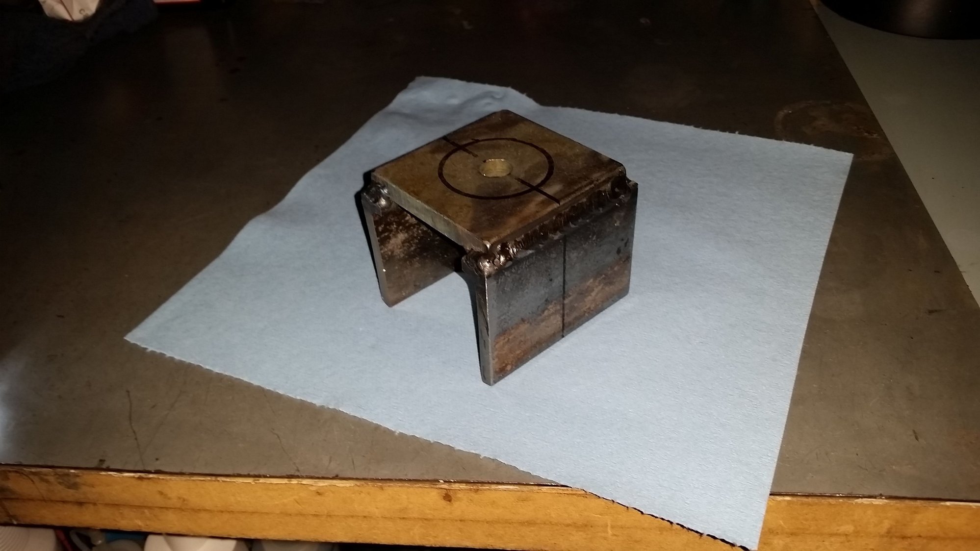 I built a jig to press out u-joints with my press. Measures about 3" length & depth, 1/4 " steel plate. The line on the side is center point, place that directly over the horizontal trunions as situated on the press (caps off). The circle on top is the press contact point . The hole is of no value, just scrap I had. I used a short section of black pipe underneath the lower cap for it to exit through. Using something like this avoids bending anything. My advise on installing the joints is forget the press. Tap caps in with a hammer and ring the flange as you go if you want joints to be free when the snap rings go in.