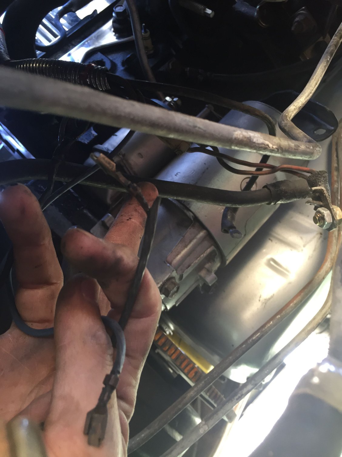 That black wire is a ground, goes on a bellhousing bolt , that other wire spliced in is not OEM.. theres no blade terminals on solenoid .. Must be for some aftermarket item..maybe ground for blower motor