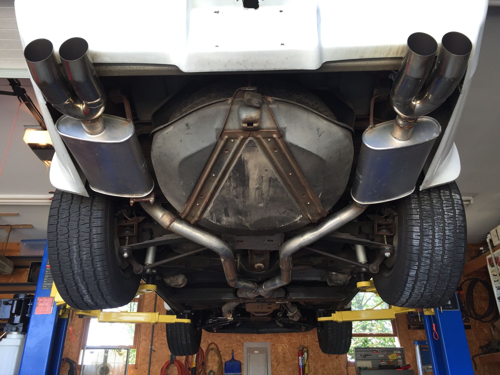 Get the car up on a lift to measure the diameter of the exhaust pipes stock was 2" but a car this old may have been changed out to larger pipes. We used 2 1/2" X pipe from Jegs, was not expensive, had a muffler shop weld it in.