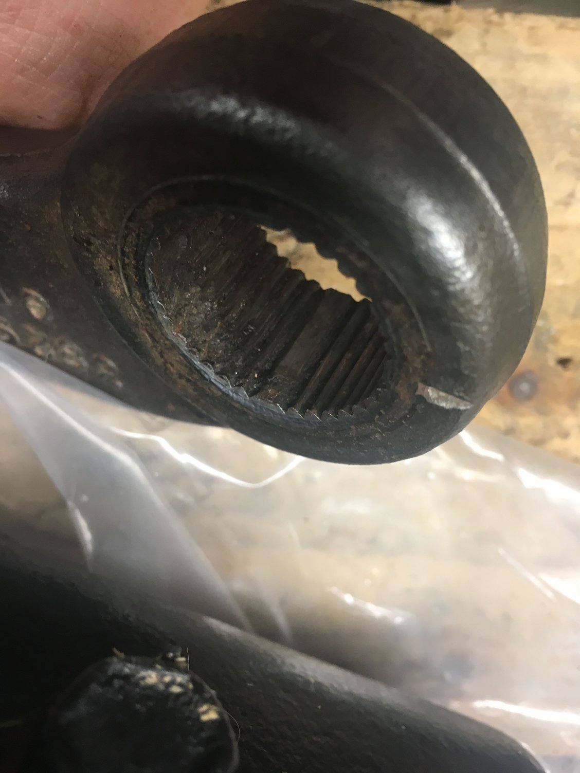 The sector splines are tapered so you get an interference fit, as mentioned those were probably exposed to the elements over time- although the lockwasher and nut would have cover the opening of the arm. Used PS arms are about $40. #383 is for PS, #451 for manual. I rarely have to replace arms but they do wear at the tapered hole and some get bent in accidents and never picked up on.