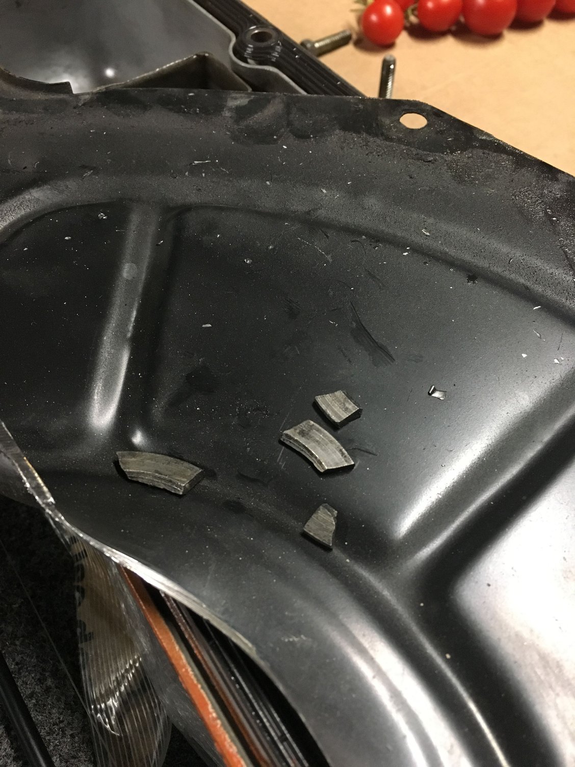 almost looks like pieces of the thrust bearing. But I don't see how they could make it out of the oil pan if that's what it was. Is that aluminum, or steel? See if you can pick it up with a magnet.
