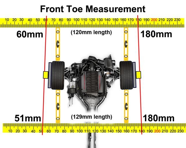Now for the fun part. What this example shows is that the distance at the front bar is 5mm less than the rear bar measurement. Meaning the tires are toed in. If the rear measurement was less then the tires are toed out.