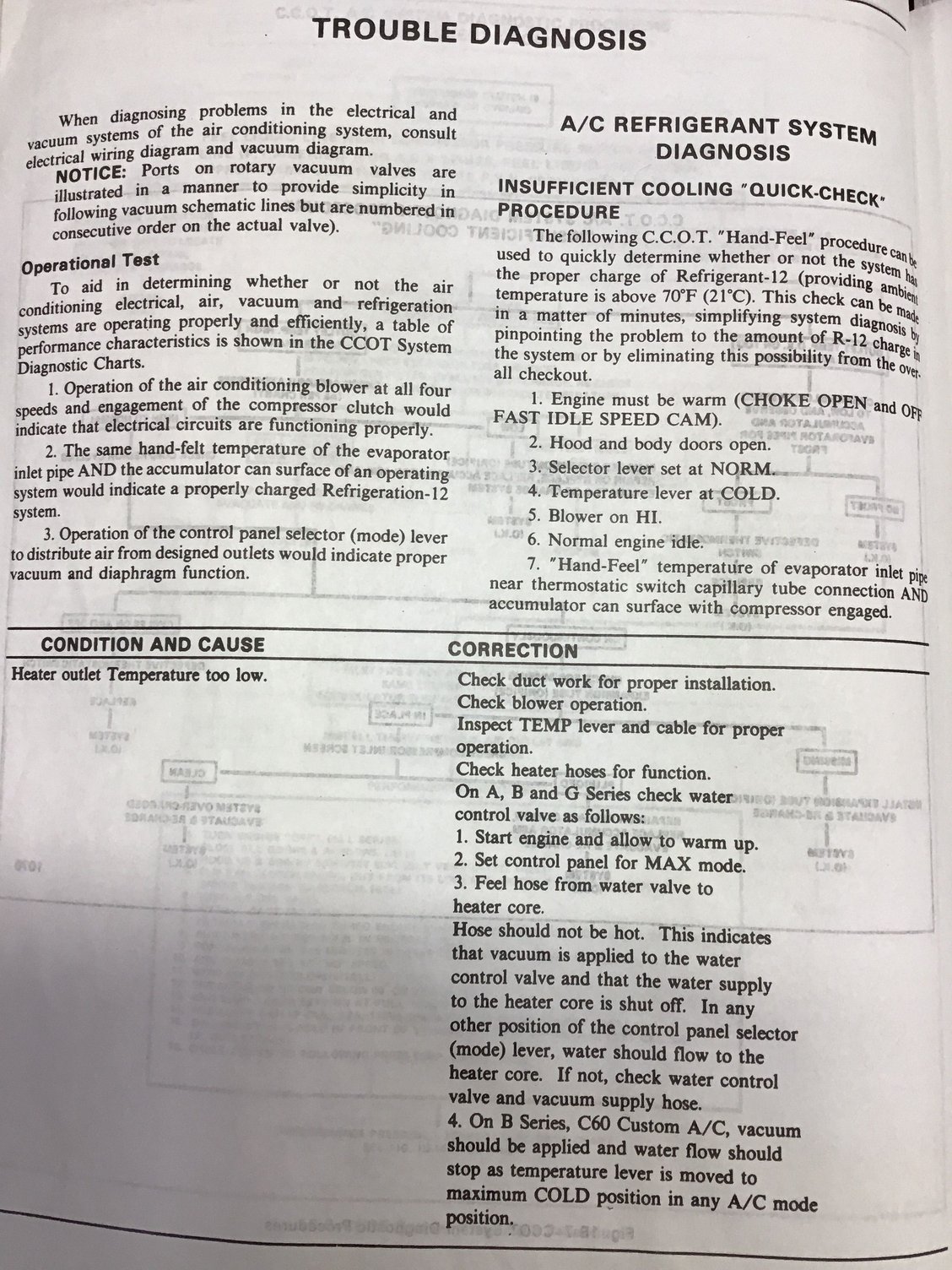 I have cold lines running out of the drier in the fender well into the box, the clutch engages on the compressor when I turn on the fan and roll the *** to MAX AC and full cold, the heater core flap closes when I roll the temperature to cold, the system has a reasonable amount of freeon in it (I did add some to it). I did notice that the heater box in the cab was warm so I plugged the coolant send line coming out of the block to the heater valve and that helped a little on the temperature coming out of the vents but it still isn’t “cold” it blowing about 75 degree air out of it (used a Digital thermometer to verify). Really not sure where to go from here...
