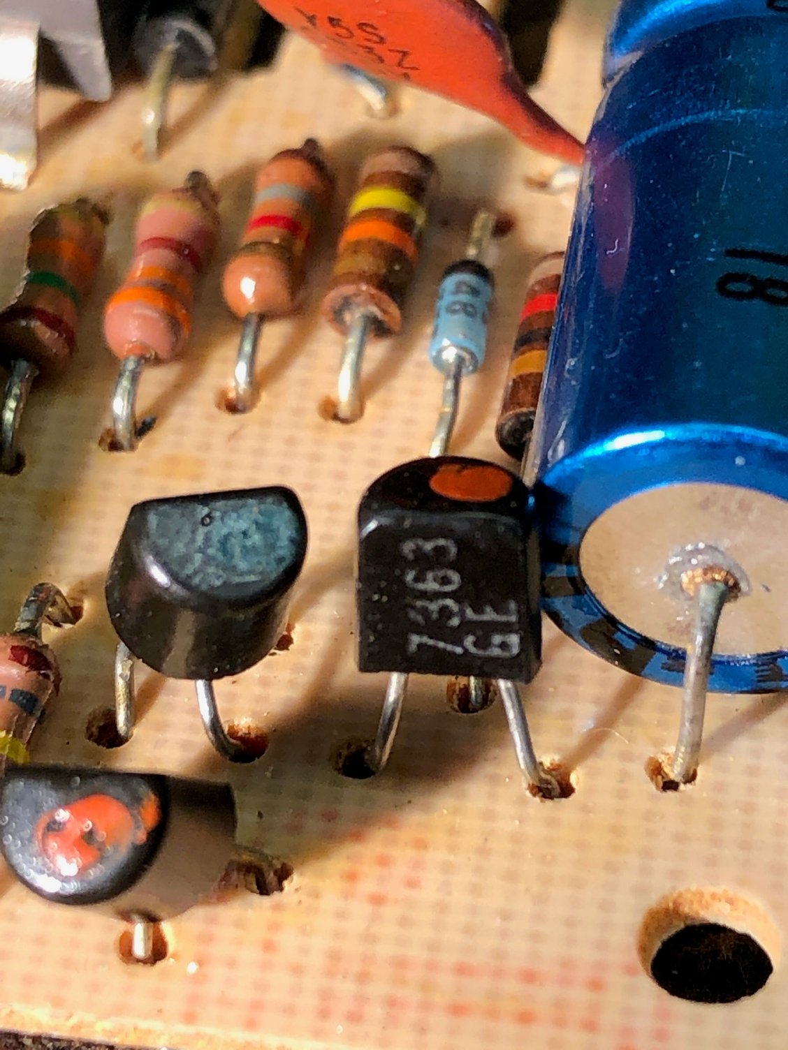 That said, the two TO-92 (plastic case) transistors are obviously 20-30V or so very low current germaniums. I got the best results from the 2363 which seems to be 20V, .005A PNP but I can't verify. If so I expect the other is an NPN with very similar ratings