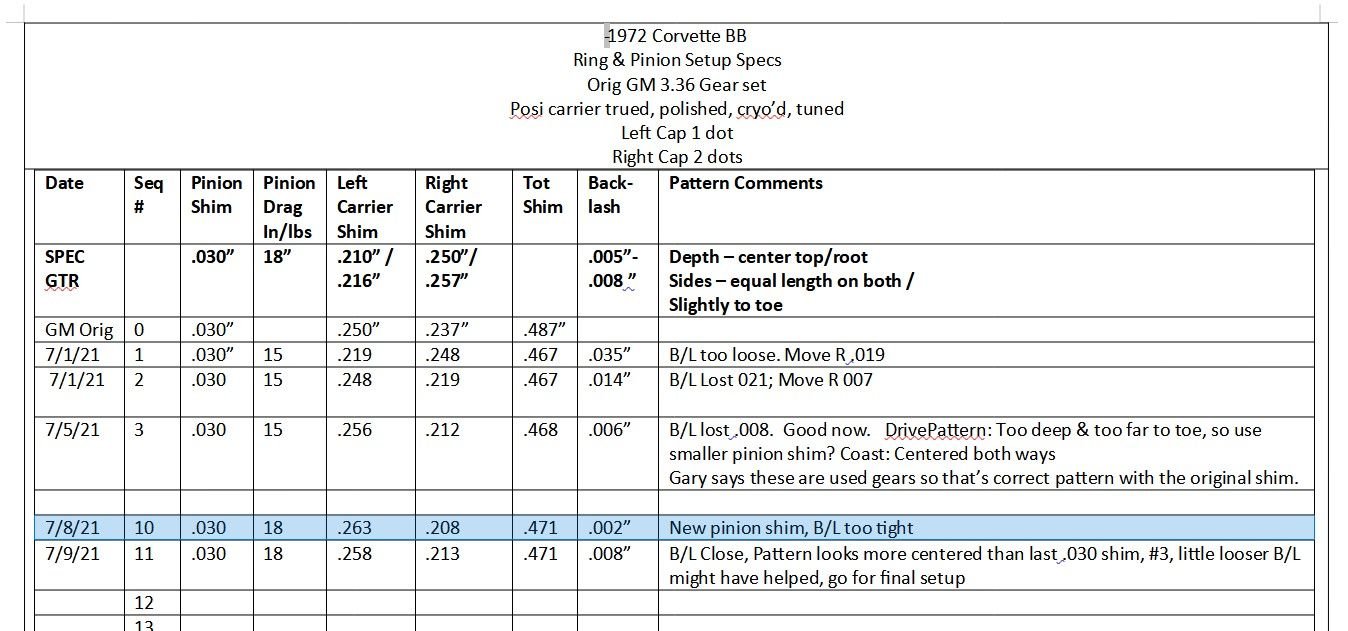 I did some other measuring with a different pinion shim just to see the effect. Gary said use the original shim for my used gear, so I went back.