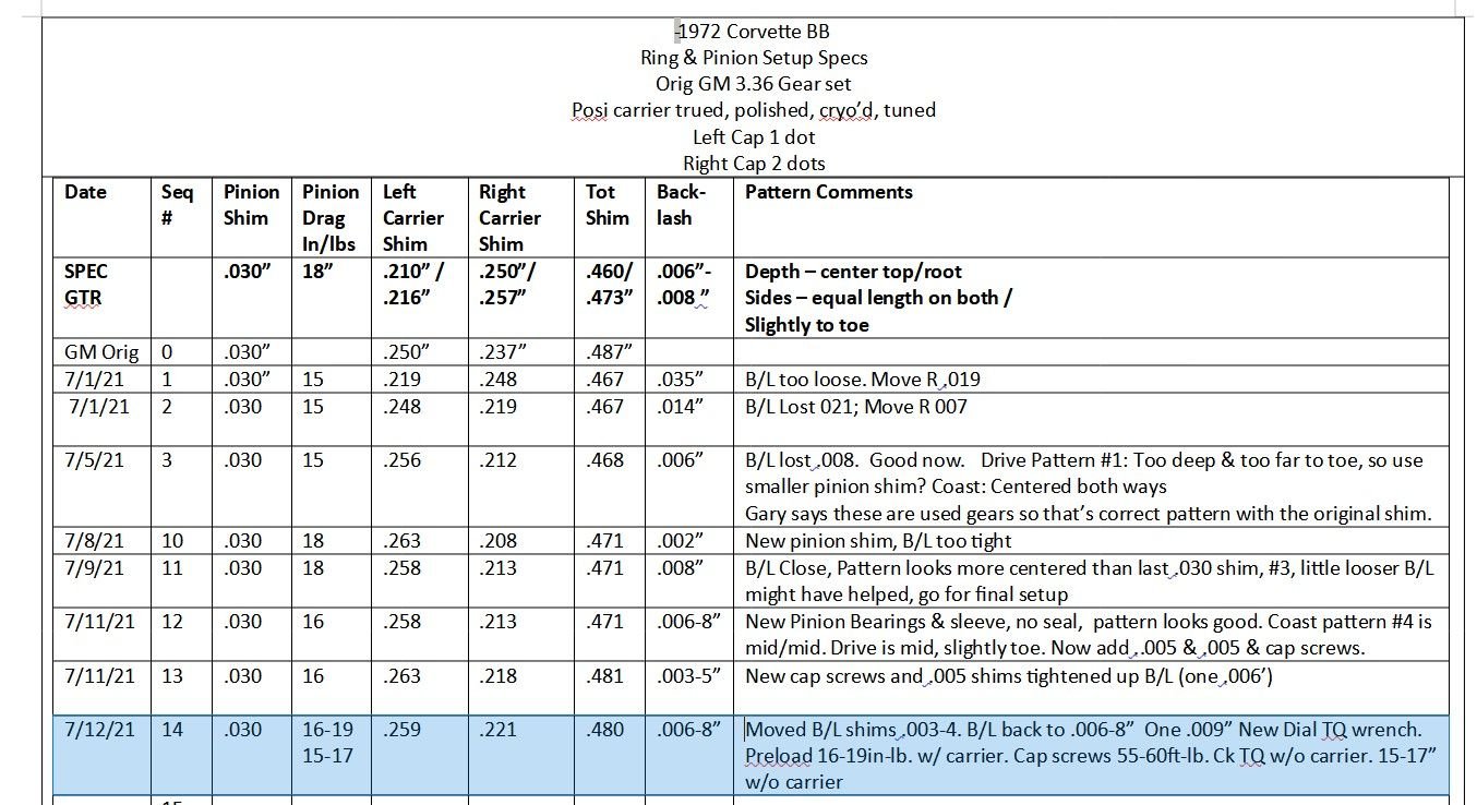 If you are satisfied with the pattern, go to the new bearing and recheck to make sure it hasn't changed. It sometimes will once my setup bearings have been used a dozen times, then I make up new ones. If you go with a solid sleeve it has to be machine fit, the shims sold with them do not come close. If you are using a crush sleeve you get one shot at reaching 15-20 in/lb, I set them at 17-20. If you go over 20 you have to buy another sleeve and start over.