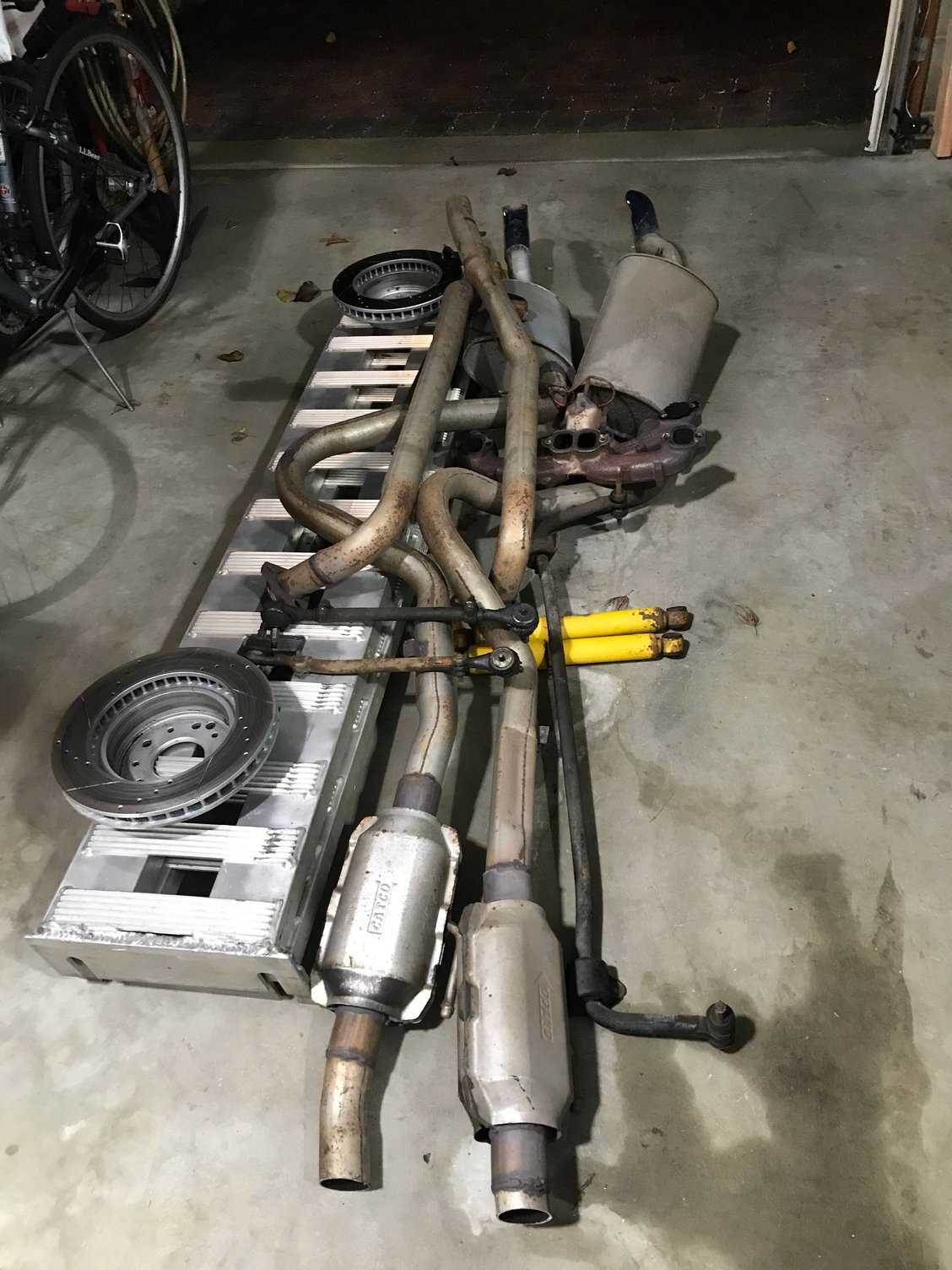 Either this car was hitting curbs or the alignment guy said screw I’ll bend them instaed of threading them in or out. These don’t look straight to me. Cores. Someone wanted red calipers so just slap some red paint on them. Pile of scrap metal other than my approach ramps. All cleaned up and put away for the night.