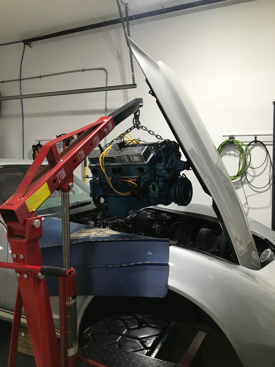 Project is going well. I'm down to my last two bolts on the engine mounts to remove before pulling the engine out. A friend of mine came over Saturday to deliver dinner for my wife who broke her fibula and tibia bones near her ankle while we were in Hawaii last month. So, i got him to help me remove the hood while he was here. He's an amazing fabricator of almost anything you can think of. He's the one who's going to modify those budgets (Impala) CA's I bought as he's got a milling machine, can do the needed welding, etc.