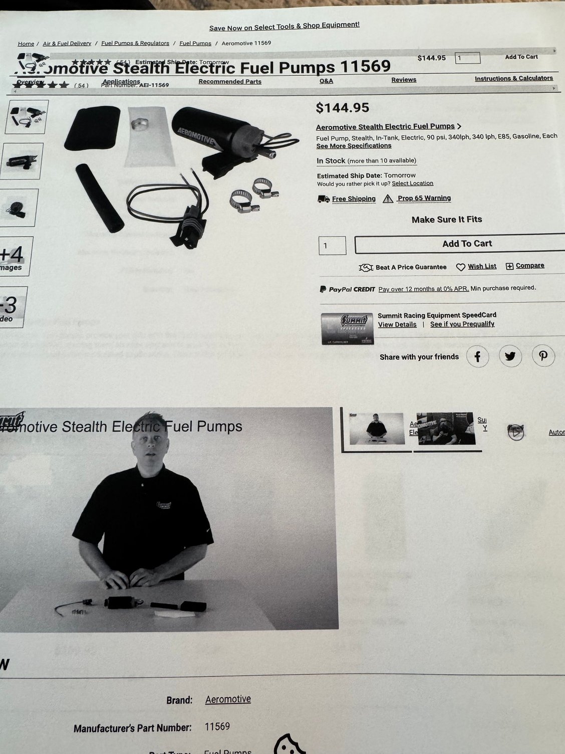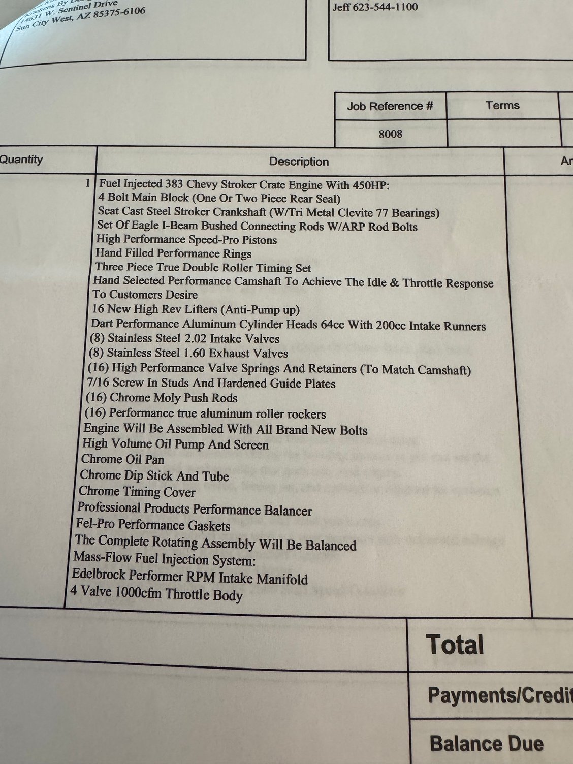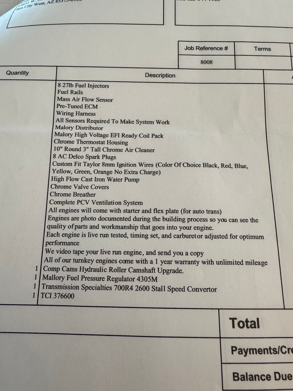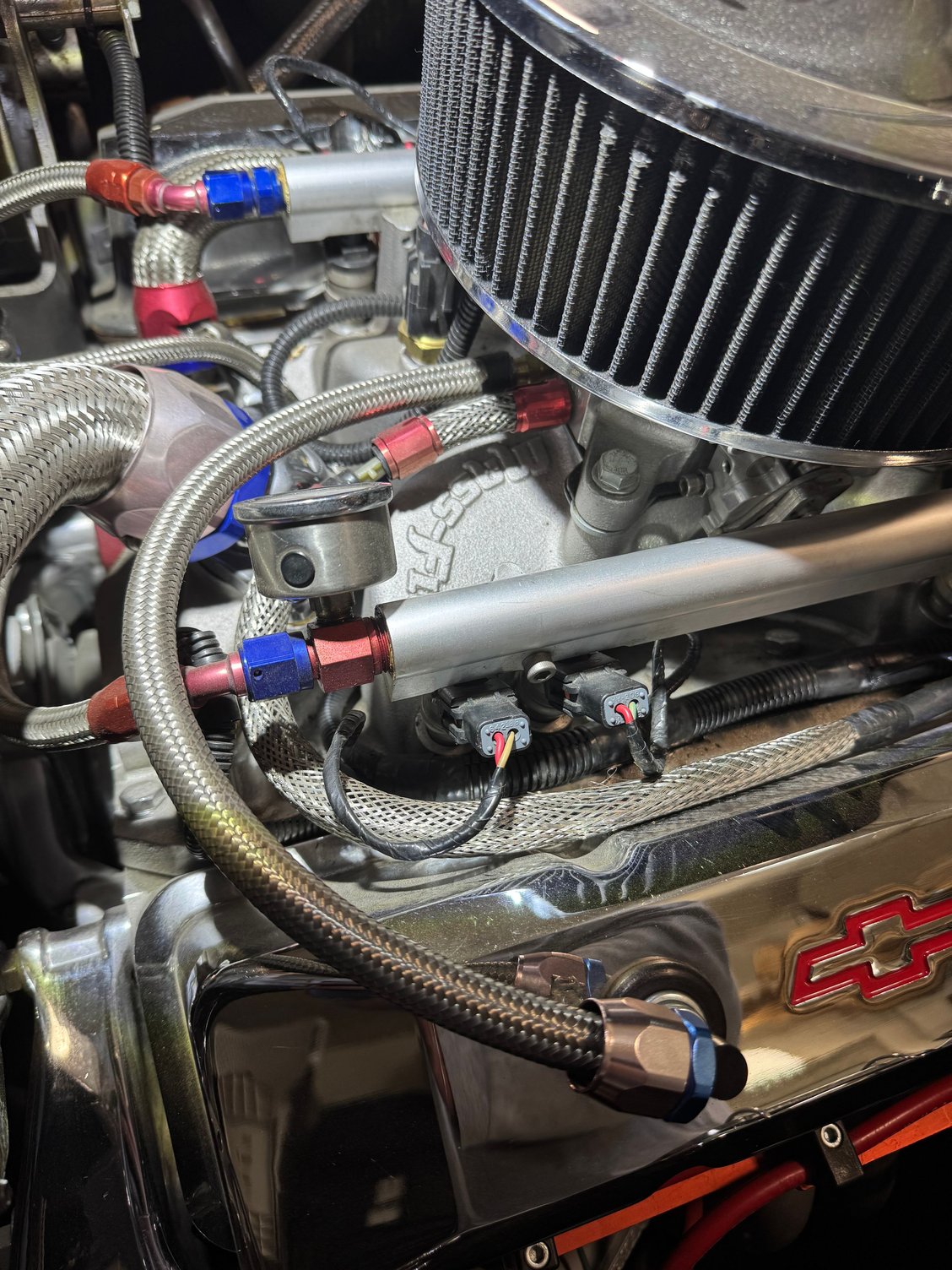I don’t mind the questions at all! I try and give all the answers I can but sometimes I don’t have them as the car I bought from the previous owner he didn’t really have any knowledge of the car. He just paid for the install of parts because people probably “told” him to. It has a 383 stroker crate engine and a Mass Flo fuel injection system. Which from research I believe Mass Flo isn’t their name anymore. I believe it’s Pro M or something like that. Has a Mallory fuel pressure regulator and an automotive stealth electric fuel pump..