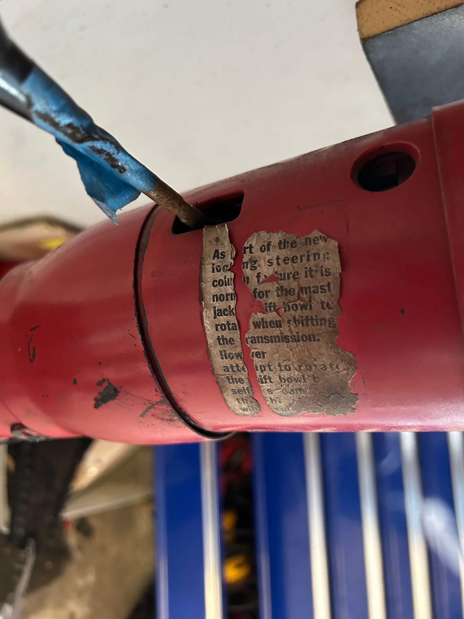 Mike, all the vendors sell the sticker. That is the very early sticker. I have a couple of the later ones here for the two columns I did if you need one fast. A lot of those diagrams are generic from different years. The early 69's like yours differ in a few things internally to the later 69-75 columns. My cell is 706-338-9434 if you need any help. Have you checked the length of your new shaft and the shift tube before you assemble?