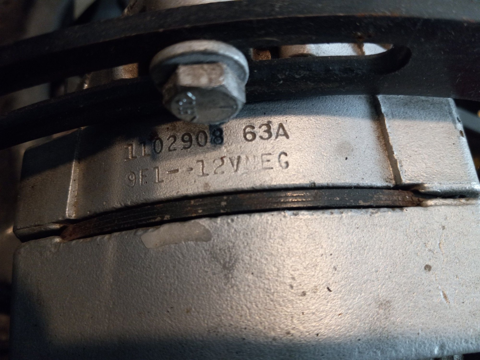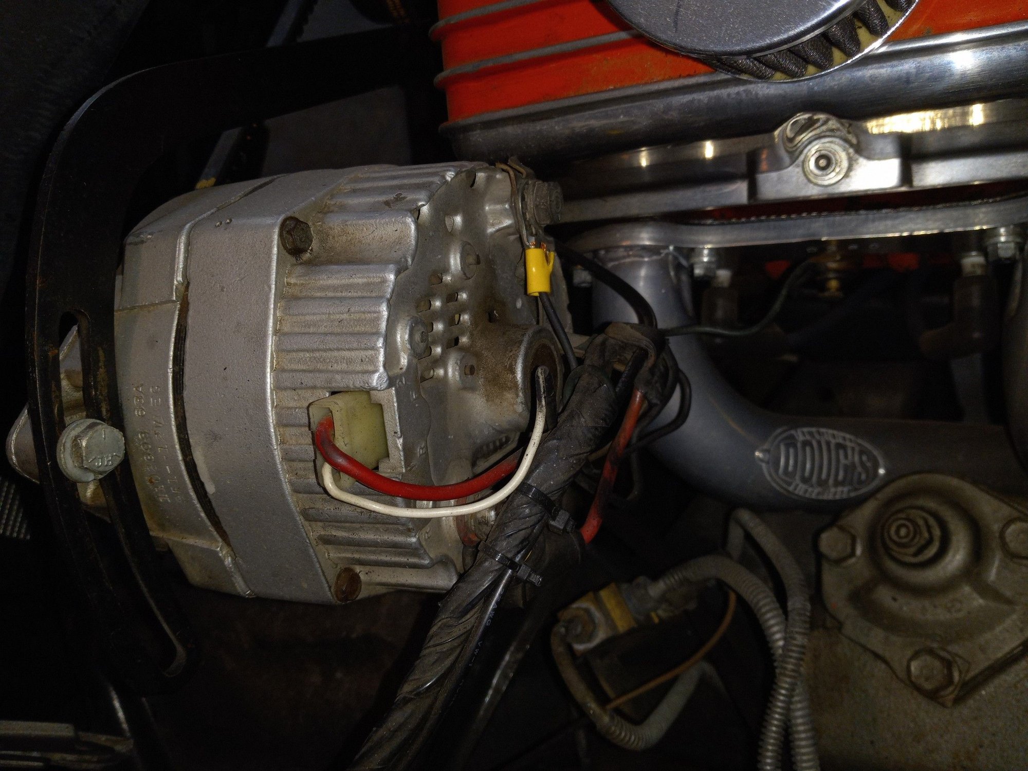 As I said, the alternator is now on the drivers side. It's apparently a Delco-Remy, 63A, internally regulated, #1102908 used in late 70's Corvettes.