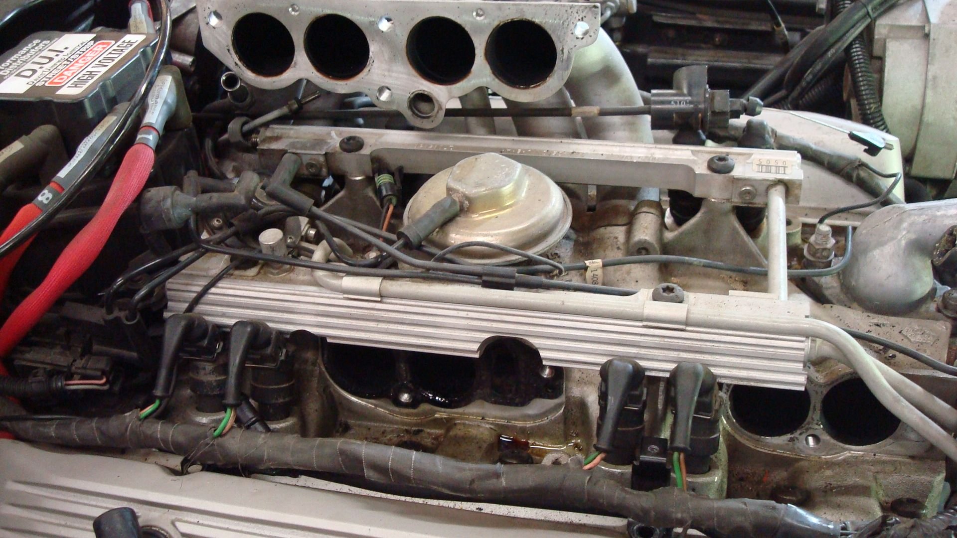 At this point I installed an new EGR valve and new fuel injectors. I used Felpro gaskets and the Right Stuff sealant to finish things off. I wish I had taken more pictures of intake disassembly and cleaning process. I also removed the valve covers and use fresh Felpro gaskets to seal them up. I also converted my valve cover bolts to the studs as recommended. Then distributer got a new cap and rotor and new spark plugs and wires were added. Cleaned the throttle body and lubed the linkage. Replaced all questionable hoses.