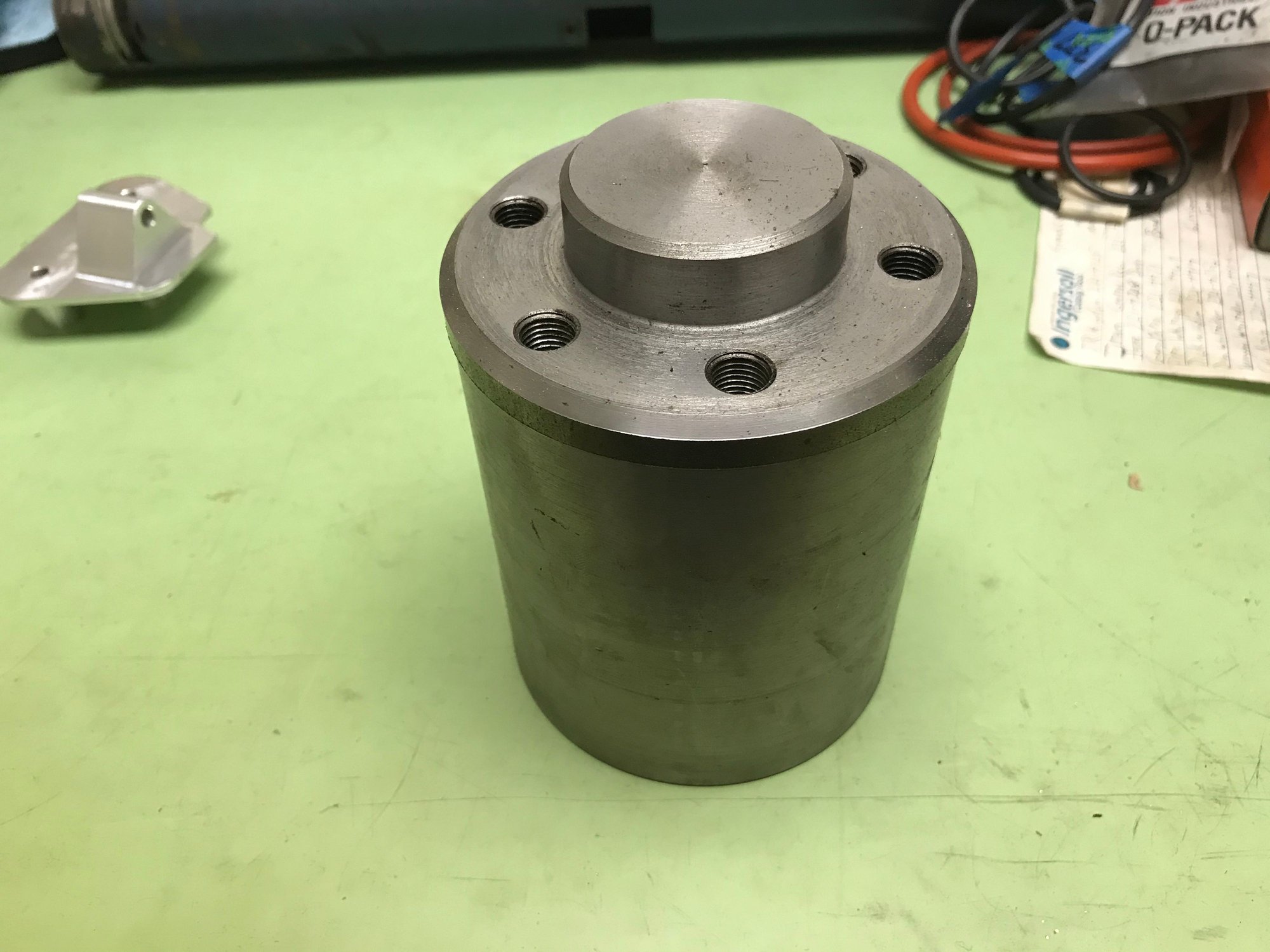 I made this mandrel that is the same mounting as the flange of the crankshaft. This was finish turned in the lathe that’s was used for flywheel machining so it ran perfectly true. Bolted flywheel to it as if installing on crank. In order to support the friction side of the flywheel, and to keep it from rotating in the hub, I used 3/8 set screws through the PP mounting holes to make contact with the main side of the flywheel. To make sure I didn’t distort the flywheel friction side, I laid the flywheel on a flat surface and placed dial indicators on the friction surface to make sure I didn’t over tighten the set screws and warp the friction surface.