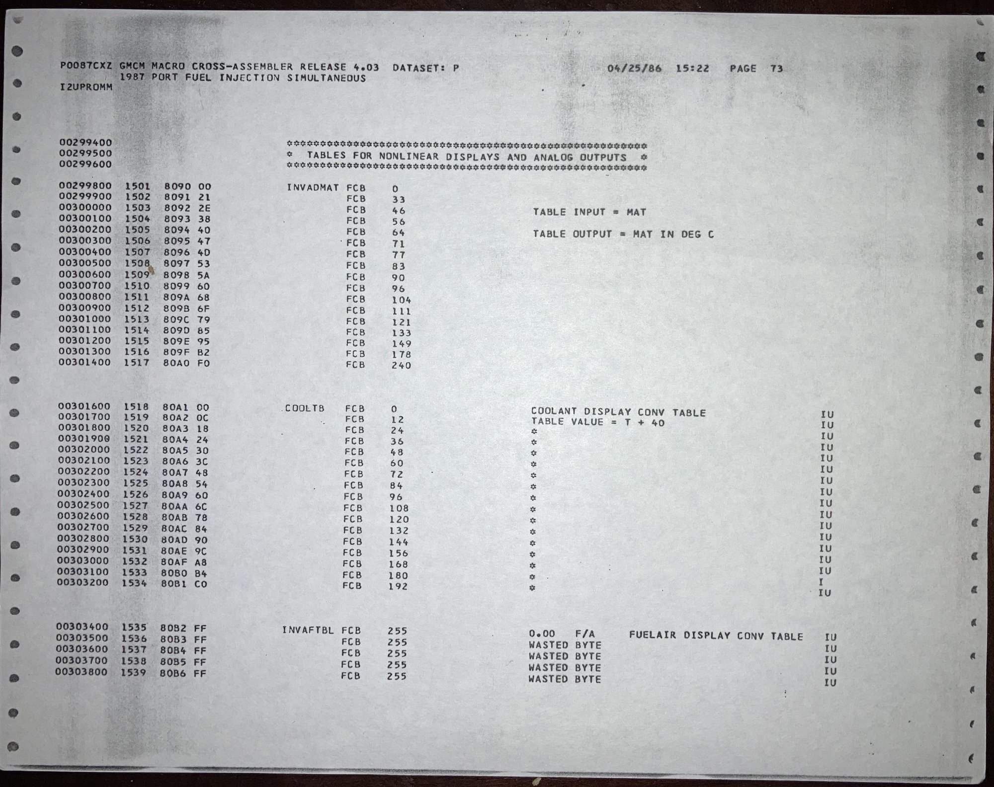 Update: On second thought, I think the table that I have shown includes a 40 °C offset, even though it is not explicitly commented that way. With the 40 °C offset subtracted from the output value, a raw value of 30 would be about equal to 5 °C or about 41 °F. For 87-88 cars, a raw value of 46 would be about 15 °C or about 59 °F