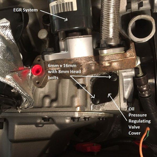 On the 1995 ZR-1 the Oil Pressure Valve Cover Plate is impossible to get to from above because of the EGR. But....one can get to that Cover Plate from below by removing the Passenger side strut that the Passenger Side Motor Mount is bolted to (no pressure on that strut from motor mount). Remove two 15mm bolts toward front and two 13mm bolts on frame rail passenger side. Remove 18mm Nut from Motor Mount Stud and drop the strut. The Oil Pressure Valve Cover Plate can be easily seen toward front where Strut was positioned. The bottom 6mm bolt is easy to unscrew and the top 6mm bolt required a vice grips gripping an 8mm open end to loosen. Both 6mm x 15mm Bolts with 8mm Heads were replaced with 6mm x 15mm Bolts with 10mm Heads.