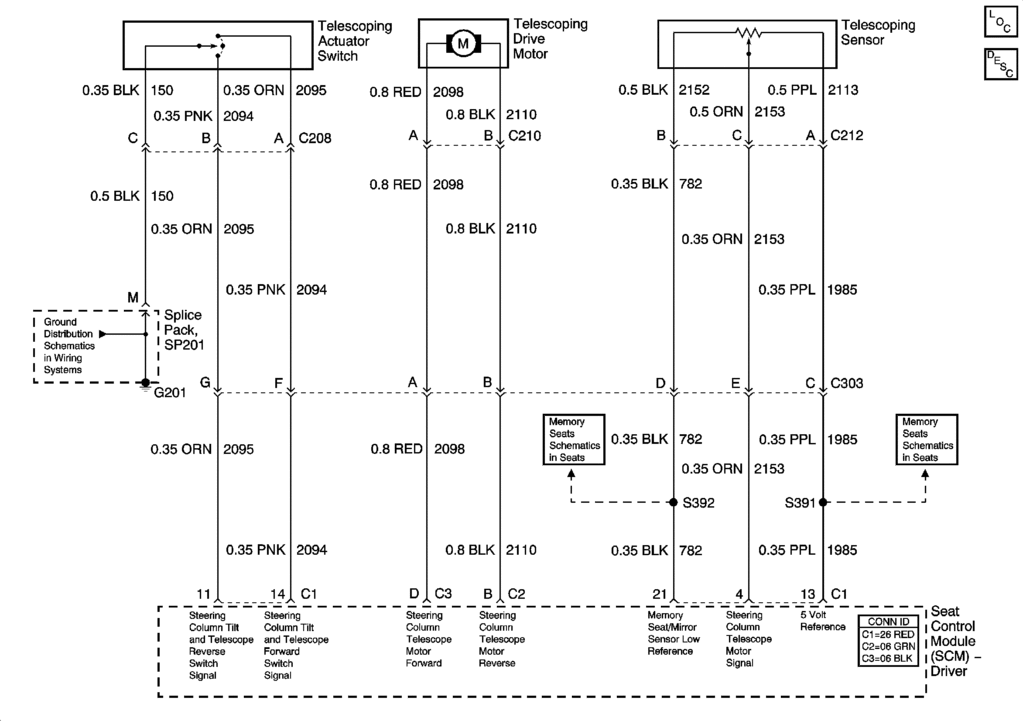After replacement of the seat control module, it is necessary to program the telescoping soft stops. Each soft stop is a programmable end of travel that is set approximately 1.3 cm (0.5 inch) from the mechanical end of travel. The steering column has a soft stop set at each end of the telescoping in/out movement. The system uses soft stops to prevent wear on the system by ensuring that the steering column movement stops before it reaches its mechanical end of travel in any direction. The soft stops are initially programmed at the factory. The stop positions may be reprogrammed, which is necessary any time the seat control module is replaced, as described in the following procedure.