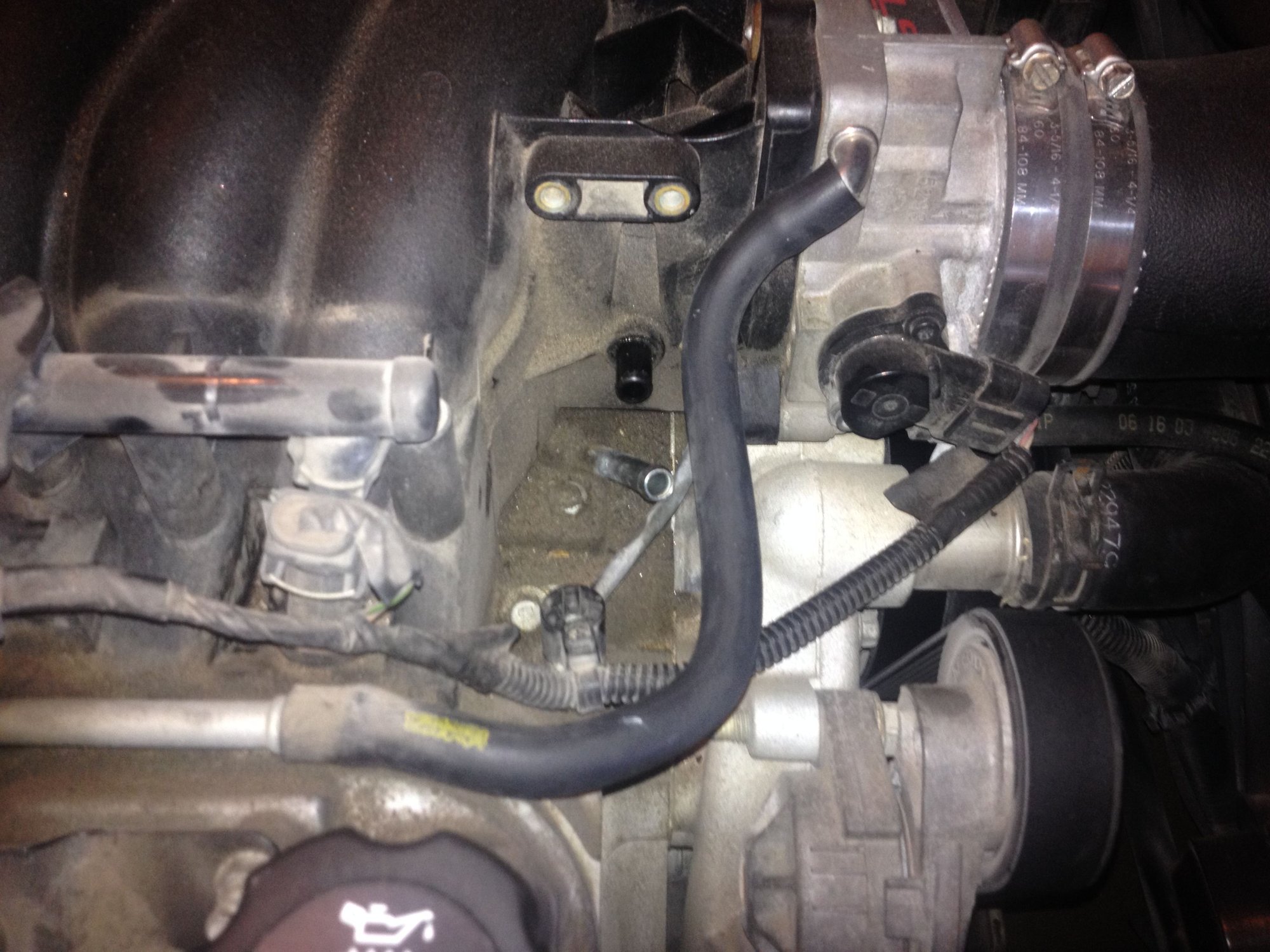 I decided that it would be easy enough to change the pcv but I am having the devil's own finding it. I did find a loop of hose (and only hose) going from one 'outlet' to another just under the throttle body - seems a logical place for the valve to have been. It was so cracked and brittle it fell apart when I handled it. You can see where it was attached - the lower silver-colored and upper very black attaching point. I see no other unaccounted for hoses and there is no outlet at all on the rear passenger side rocker cover as I have seen pics of. Is that where the pcv would have been? Could it be that it had no pcv valve at all? - bypassed/eliminated? Might account for a rough idle and whistle when cold.
