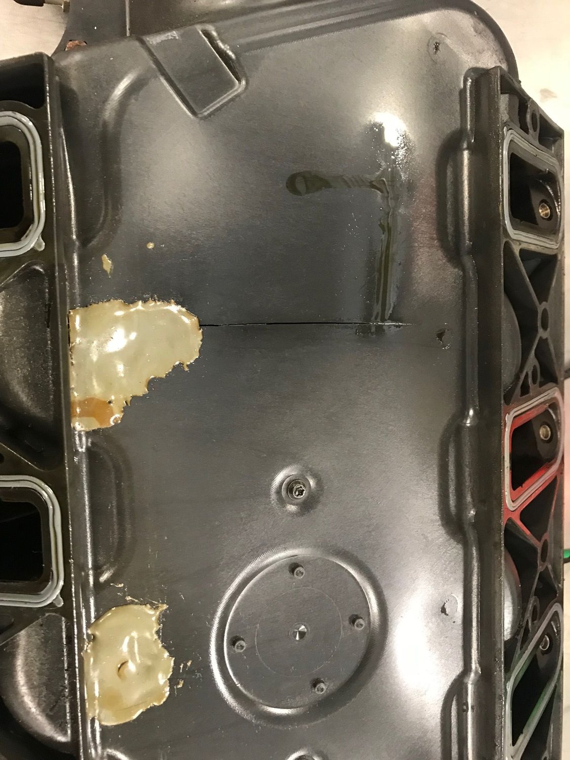 Sooo...it looks like either the previous owner, the original owner or a mechanic likely over torqued the bolts or used the wrong bolts during install and cracked the intake. Did they replace it? Nope! The cheap bastard simply epoxied the cracks. It became my problem when the epoxy repair finally failed. My RPMs were crazy erratic, idling super rough and shaking and when cruising it's like the cruise control was on. As soon as I let off the brake it would jump to about 2k. My amazing Vette Tech troubleshot it, talked to my tuner, smoked the intake and found the leak.