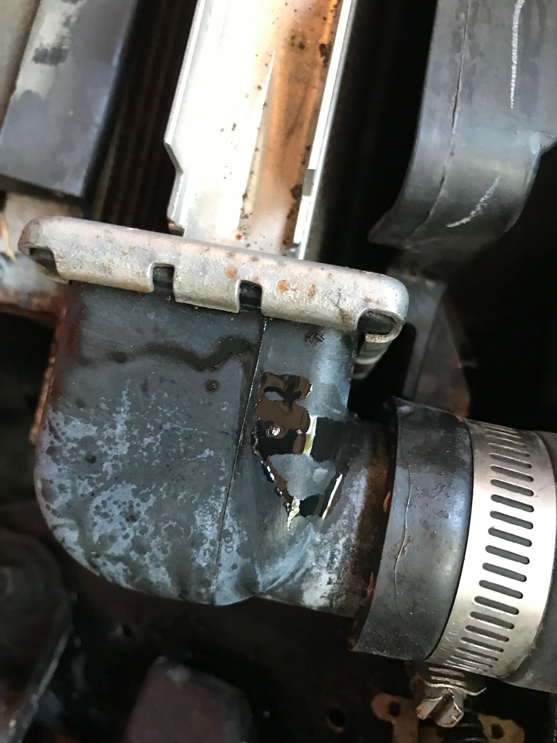 The saga continues. After running the last 2 weeks and not going over half way on the gauge it is now going up to 3/4. When I first had trouble I notice the antifreeze was at the bottom of the plastic tank when cold so I filled it to the line on the tank. I noticed a small amount of antifreeze on the ground after driving around for awhile, just figured I had overfilled. After checking closer I found the puddle was on the drivers side and the overflow side. After some inspection this is what I found. Maybe something like K Seal would work ?
