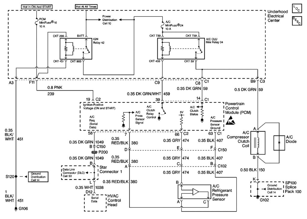 we already knew that... Results are as as expected. Excerpt from Post 39 above (I also gave you a couple of ideas to explore - check it again):Look at the circuit below. You already verified that by jumping together CKT 739 and CKT 59 (Relay 34's pins 87 and 30) the compressor clutch gets engaged, that means the control side of the relay is not commanding the clutch. Since it was determined the relay's coil is getting power from CKT 739, the only thing that can prevent Relay 34 from being activated is the lack of ground on the other end of its coil.
