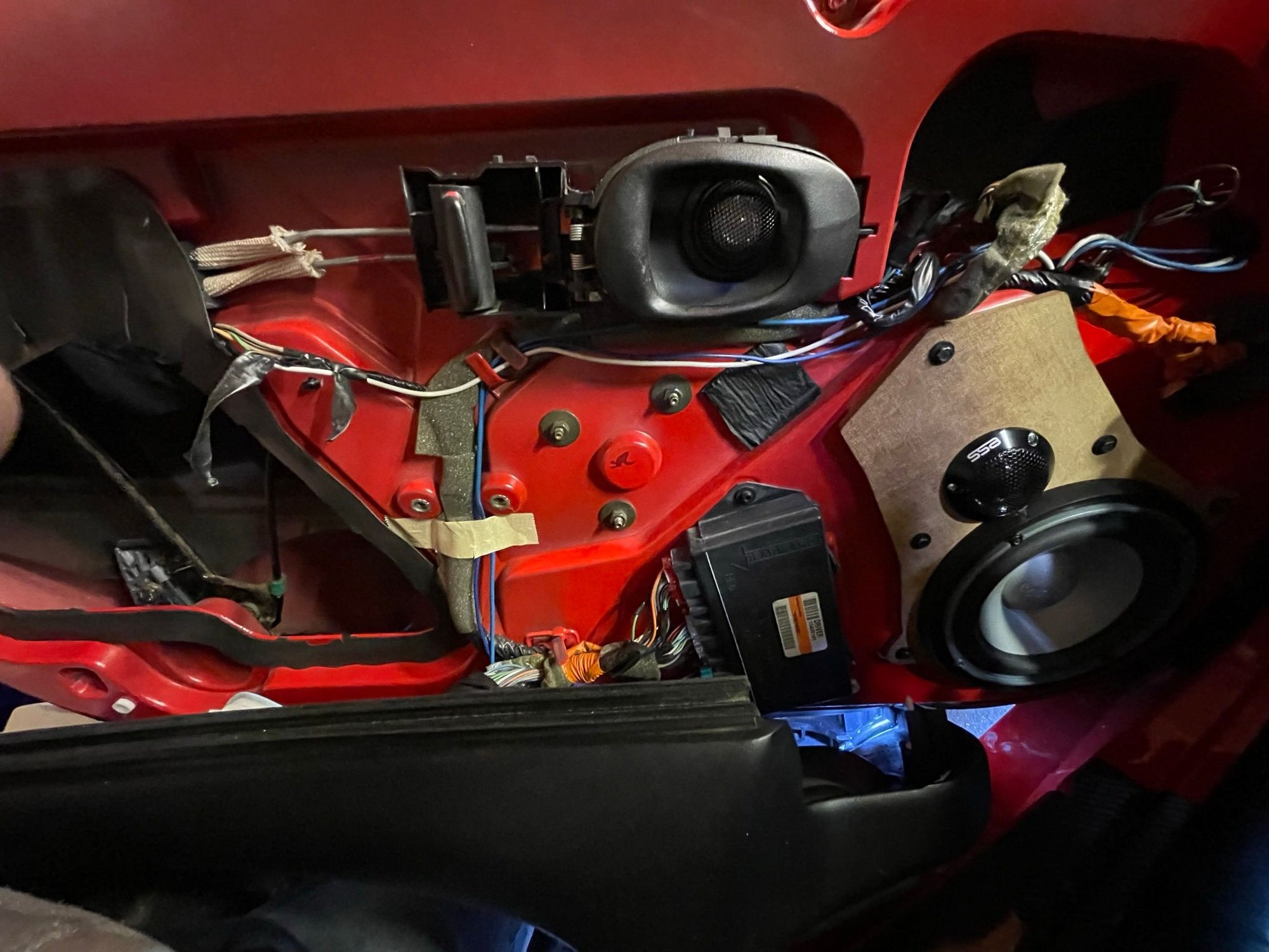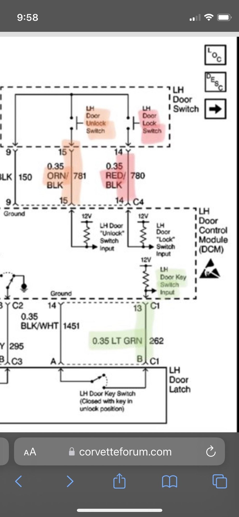 As per the schematic, we're looking for the orange/black, red/black wires for lock & unlock @ the master door switch and the green wire @ the door latch: