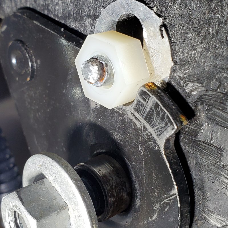 If we were to take a nylon nut which just slides over the pin, trim down the thickness to the same (or less) than the black metal part in the pic below, then shave down an edge such that when the release lever is pulled, the pin plus the nut clear the hump on the black metal part. The nut won't fall off and shouldn't interfere with the operation of the release mechanism. Maybe for good measure, epoxy the nut onto the pin so it won't rotate. (the pic below shows an unmodified nylon nut over the metal pin)