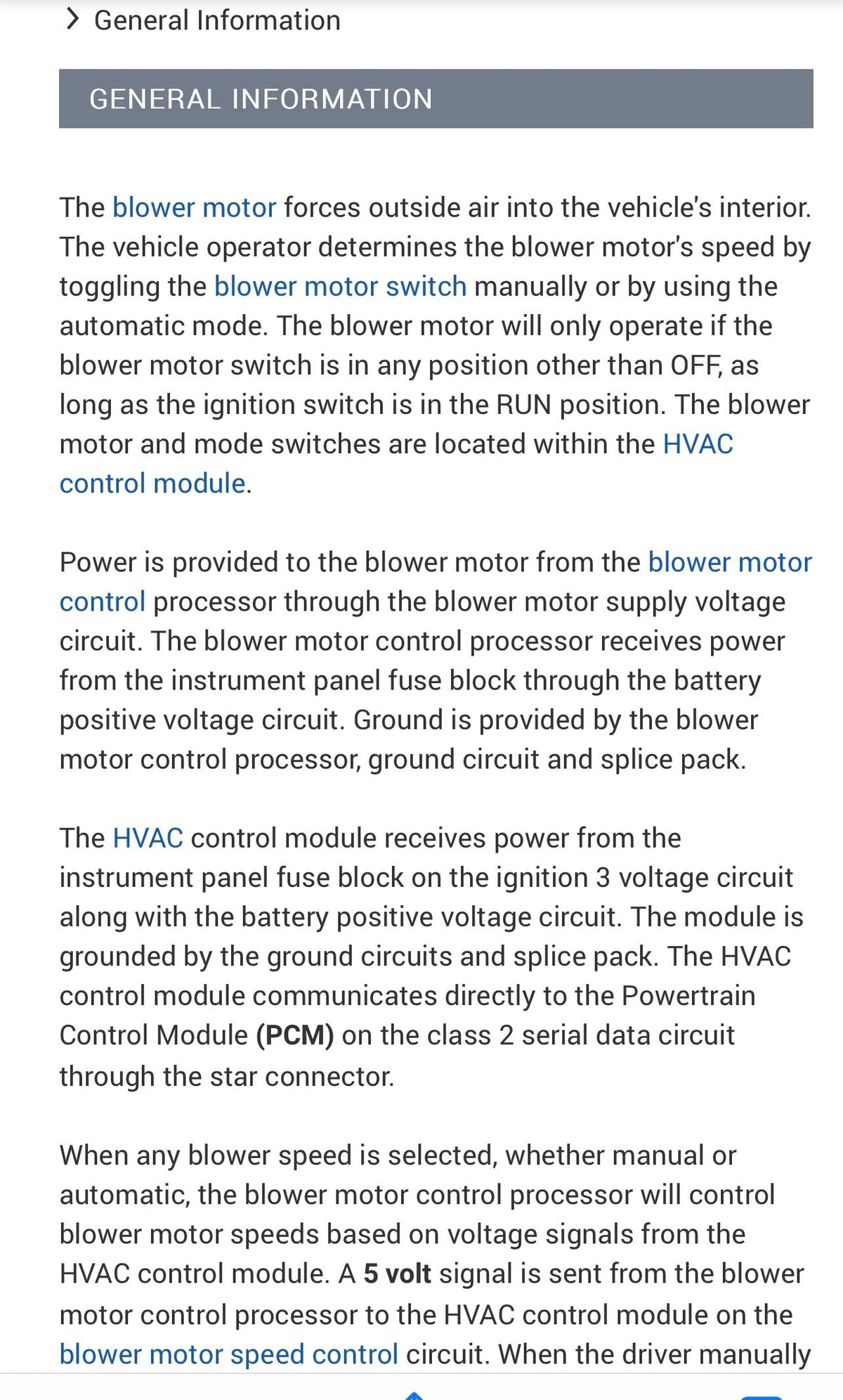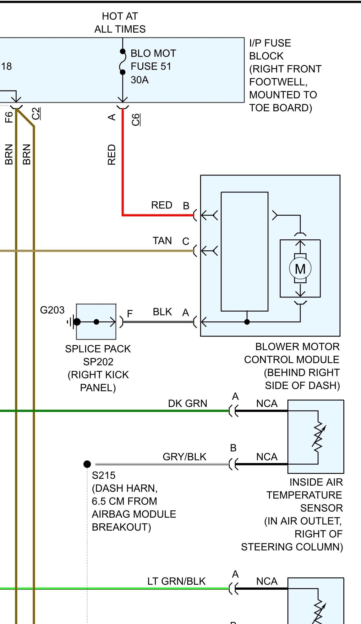 Diagram below…the “control” wire is the tan wire on the blower motor control module…it goes to the HVAC module pin C11 (Blower Speed)…helps to have a Tech 2 or any bidirectional scan tool to perform the diagnosis…a 12 volt incandescent test light helps too.